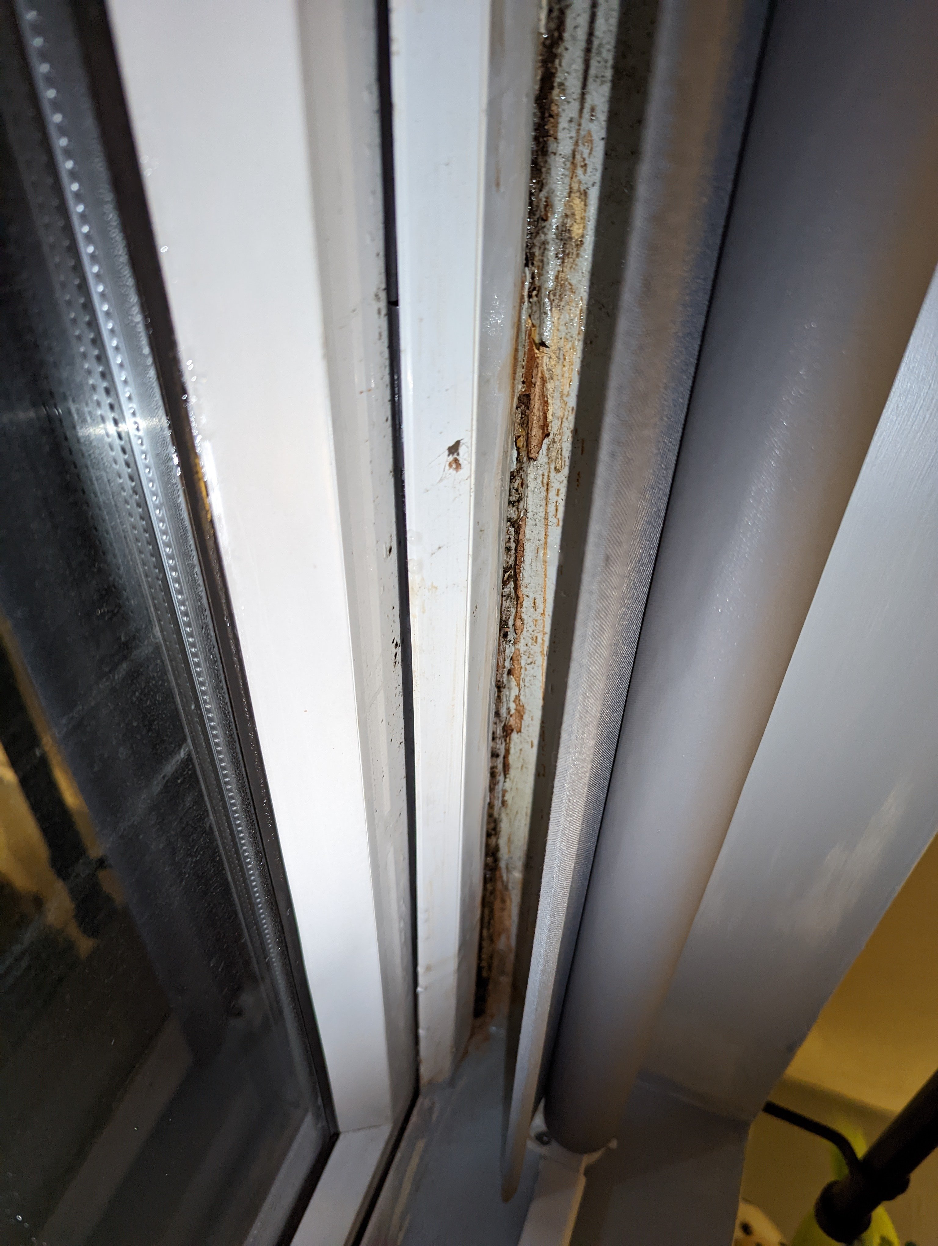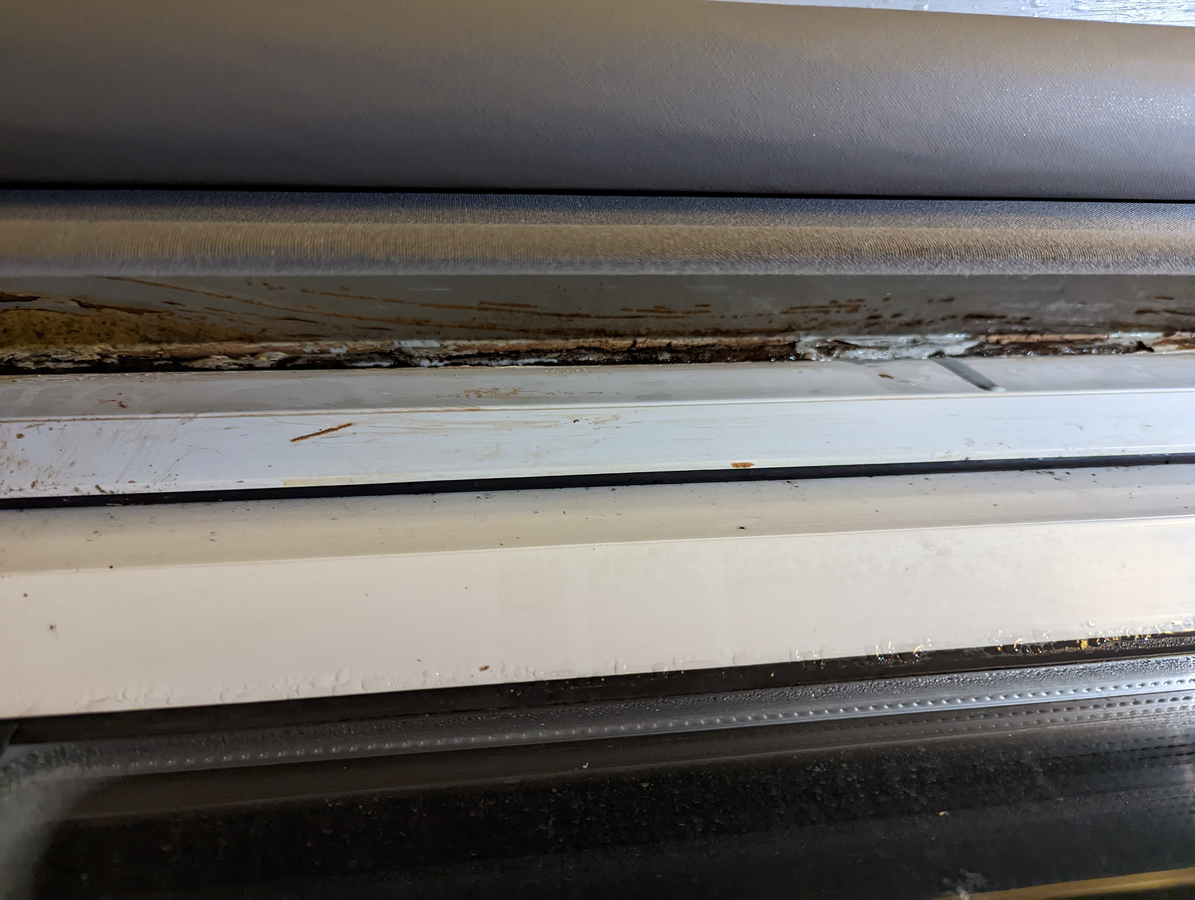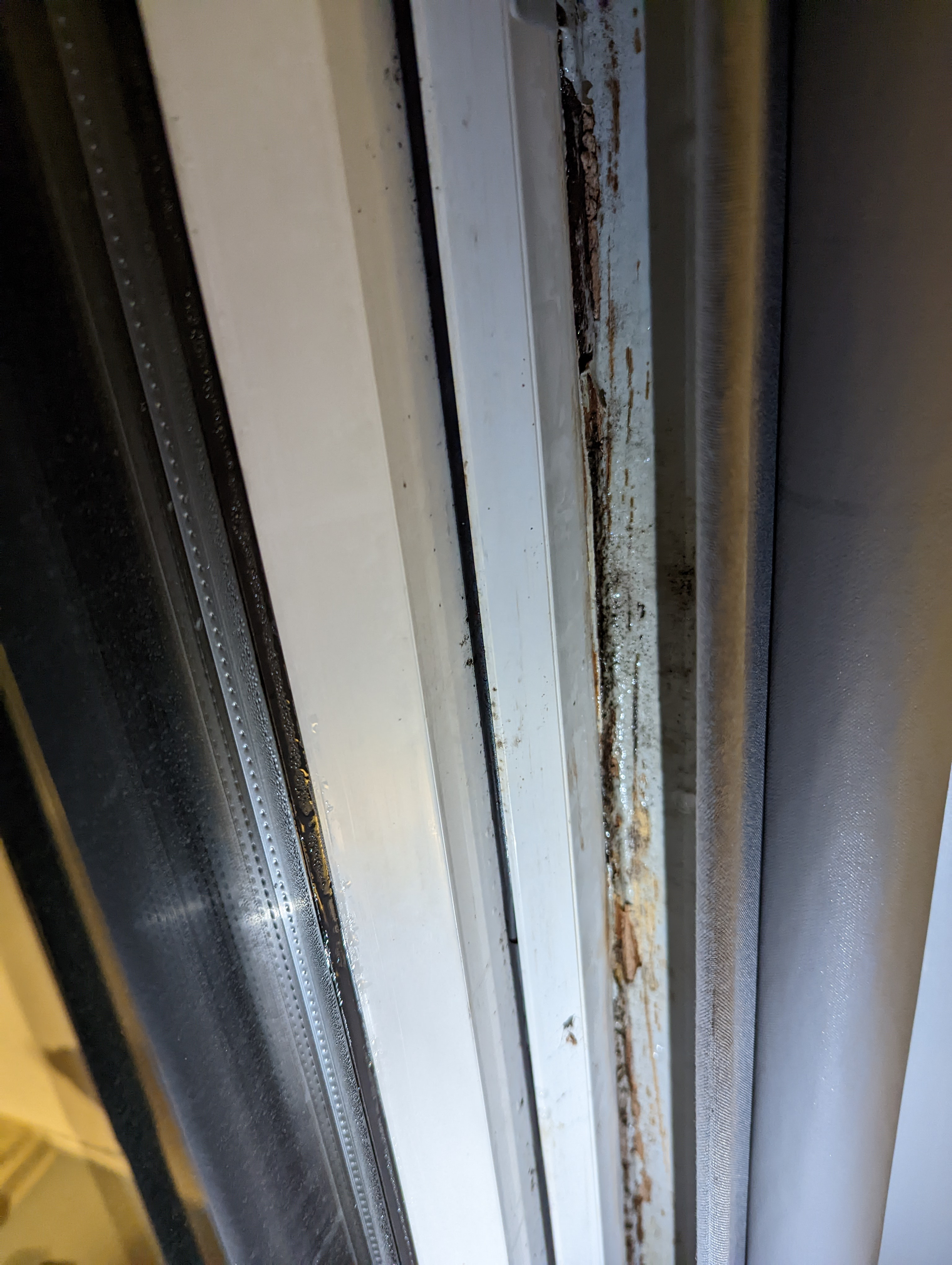 At the top of the window, it's absolutely soaking wet and feels near-freezing. And water droplets are falling down the frame and the edges.