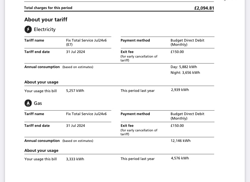 BevBeaver said:We rent and have been here for 3 years so the house possibly had economy 7 heating in the past. I don’t have long electric showers however that sounds nice. No floodlights or anything else. I have pc on during the day as work from home and occasionally tv. In evening we probably run two baths and have one shower in total. No heating on. Also two gaming pcs on in evening. That’s about it other than cookingHave you got something like an immersion heater permanently on?Your electricity usage on the latest bill is 5257kWh. For the same time last year it was 2939kWh. That has all the makings of estimated readings gone astray. You'll get more useful advice if you can give us your actual readings now.