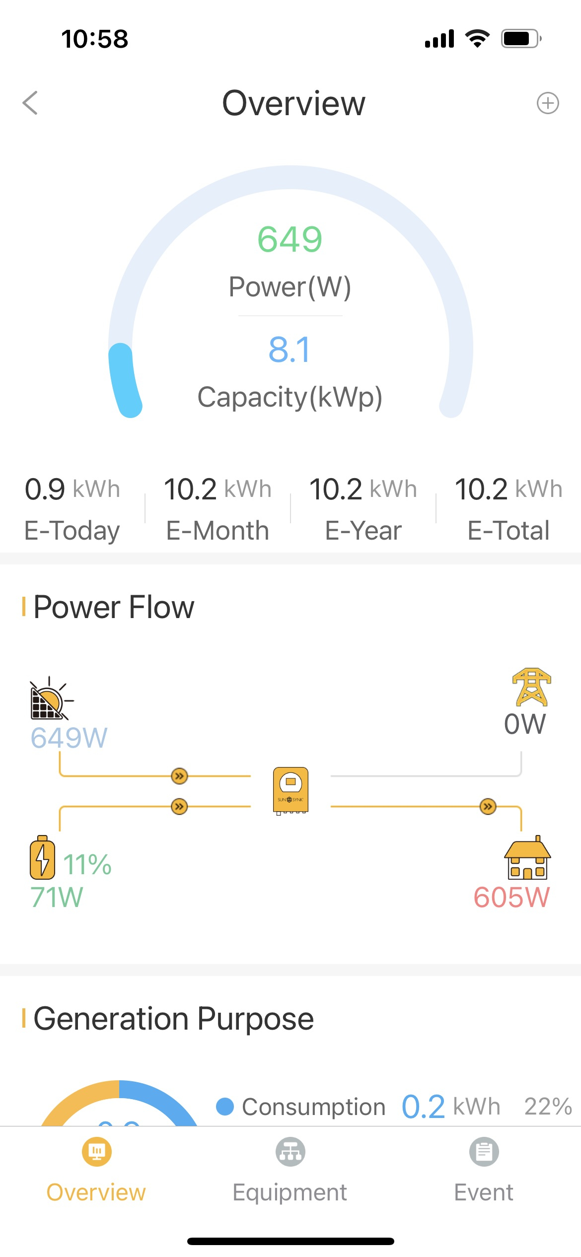 As an example, I have had 8kwh system up and running for 2 days, it’s an overcast, day at the moment, no direct sunlight and this is what the system is producing at the moment 11am.649w, and battery is giving back 71w, house load is asking for 605w. So running entirely on solar/ battery"All lies and jest, still a man hears what he wants to hear and disregards the rest”2