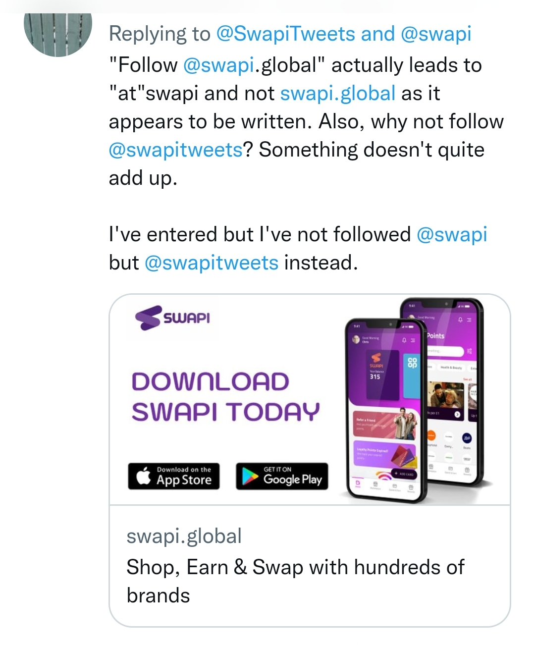 Why do you say "follow @swapi.global" which leads to @swapi who seems to be a different person/company? Also, "swapi.global" doesn't appear in the tweet as a complete handle. Something doesn't add up.