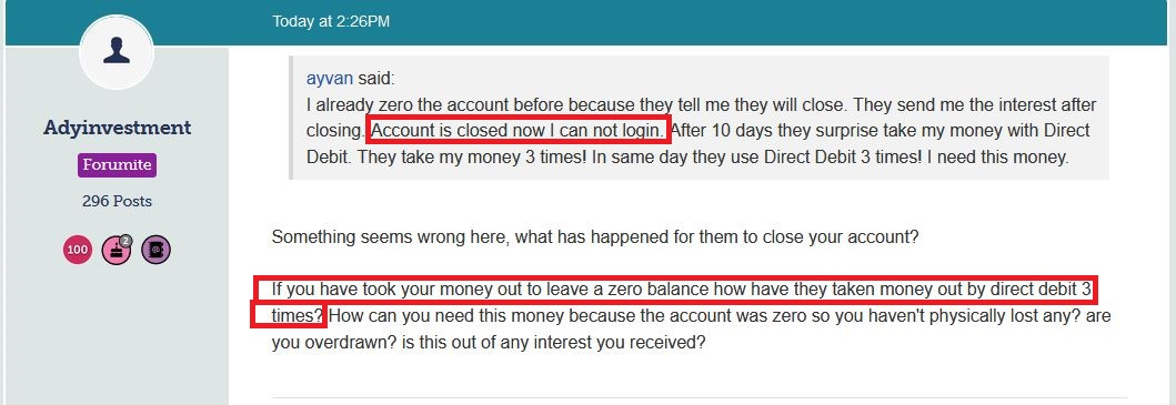ayvan said:I already zero the account before because they tell me they will close. They send me the interest after closing. Account is closed now I can not login. After 10 days they surprise take my money with Direct Debit. They take my money 3 times! In same day they use Direct Debit 3 times! I need this money.