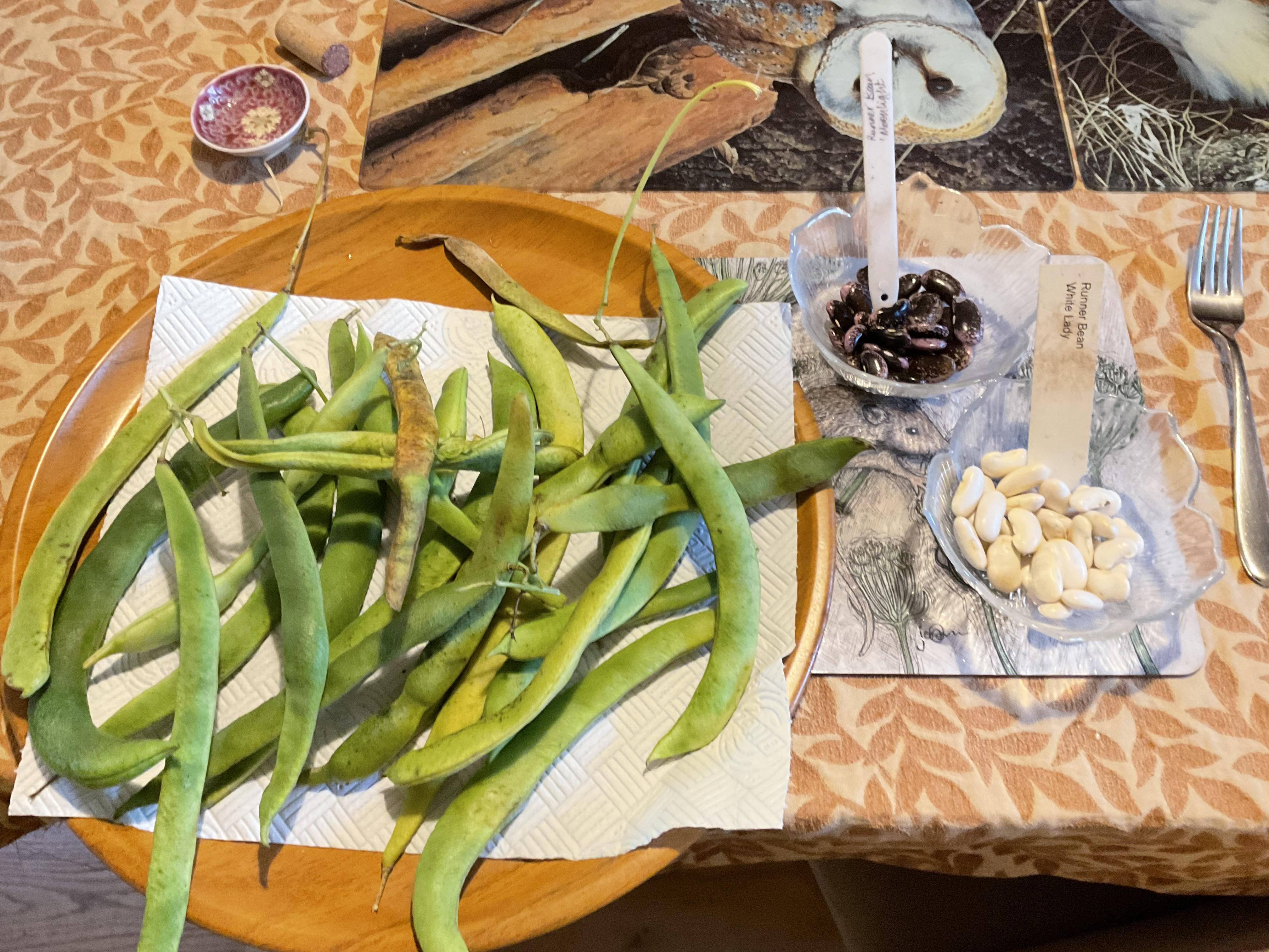 Got a crumb of time this afternoon in the veggie patch and started clearing down the scrag ends of the runner beans. I found hanging treasure! ❤️🤩 I have enough seed to sow again next year for free! I shall add the cost of these seeds, if I were to buy them, to my produce tracker! I have some relatively bulky pods that are still green, so shall try drying them for a couple of weeks and see if they produce any more decent sized seeds.Note for next year: put half of the runner bean patch to runner beans eaten fresh and at least four stations for growing drying beans …. 😊