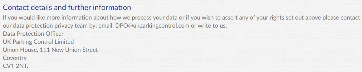 Have done the SAR request to UK Parking Control Ltd, addressed to their Uxbridge office which is the only address I have. Thought it might be better to scan and email and so, as there is no email address on their letters I set about searching for their email more specifically their Data Protection Officer and email address. Obviously found their company web page but trying to access contact link or privacy link for more information brings up a forbidden/no permission result. What I did find is that their registered address is: Union House, 111 New Union Street, Coventry, England, CV1 2NT. Tried to find their Data Protection Licence on ico and eureka so the Data Protection is registered at the Coventry address (no name) but SAR should go to