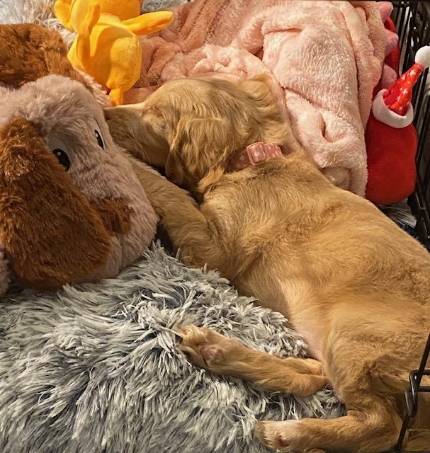 She slept really well last night, was asleep within 5 minutes in her crate and slept til 3,45, had a quick wee in the garden and was asleep again within 15 minutes. She woke up when my alarm went off at 5:30.