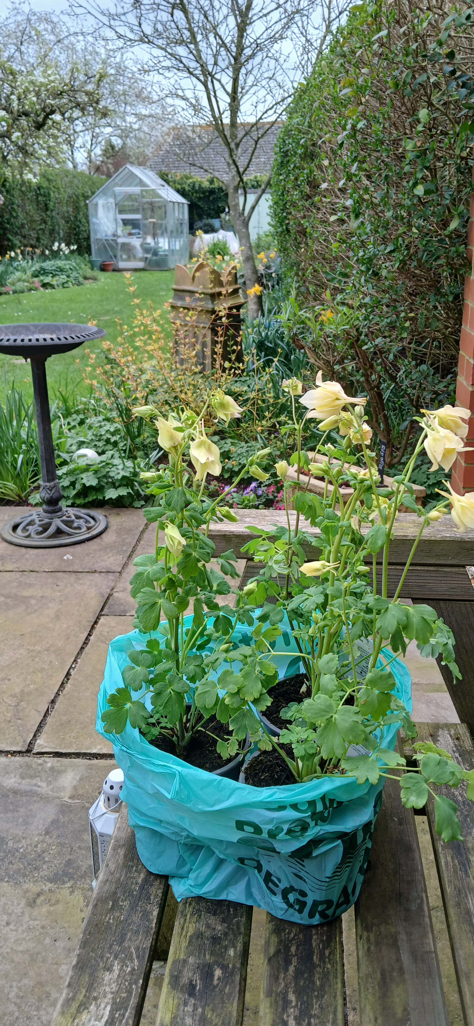 Thank-you. Yes, Ash is doing well & passed his post-op vet check-up at the vet yesterday with flying colours. This is this morning's bargain - florist on our local market was selling these lovely lemon yellow aquilegias for £1 each so treated myself to three. Variety = "Spring magic yellow". Soot should have been in this photo as was sitting next to the plants but he heard Mr F with a bag of coffee beans, which sounded like cat biscuits, so he hastened off with all speed.