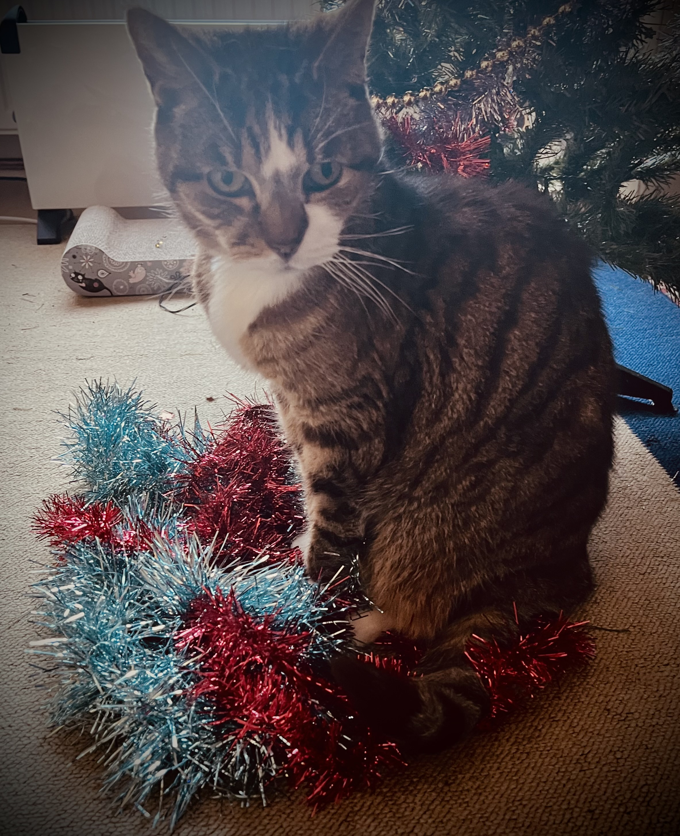 Christmas cat has perked up a bit again today and has nicked the tinsel to make her own festive bed