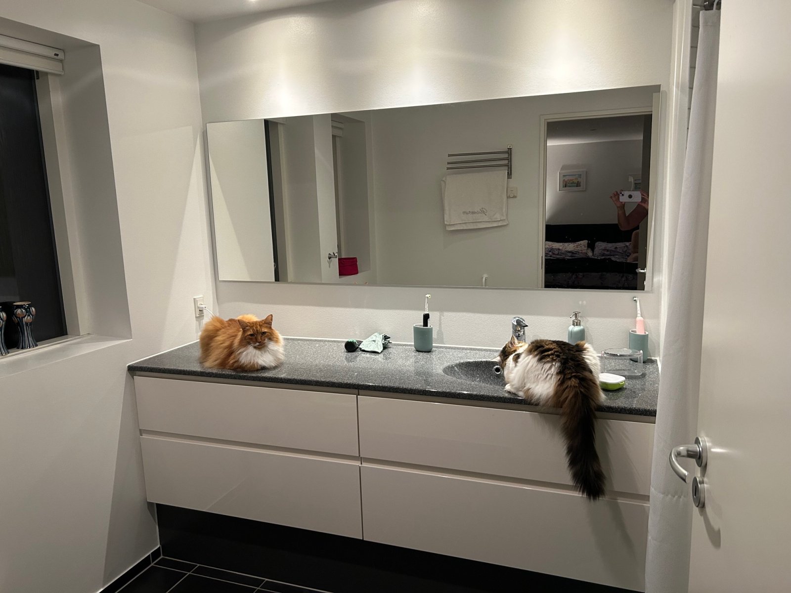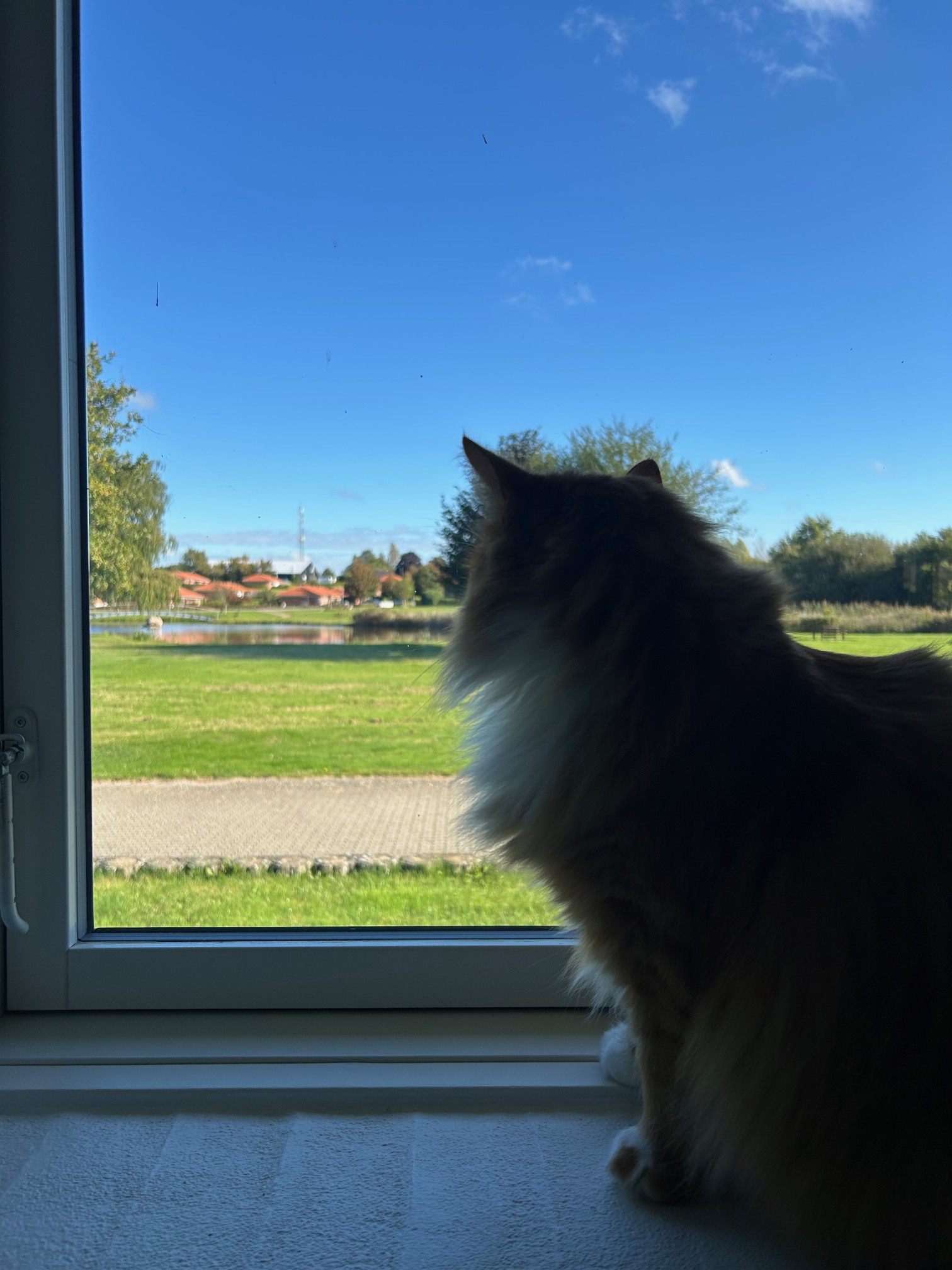 Cat looking out of the bedroom window to the lake