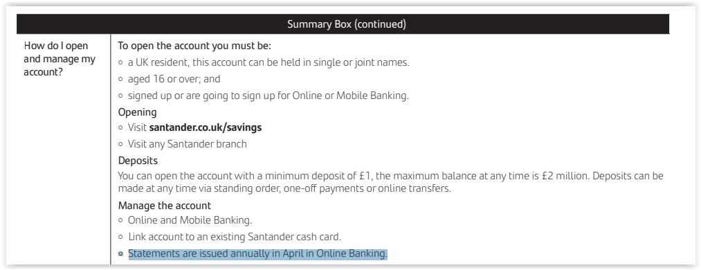 Ah, OK - it was a while ago so maybe I did need to send them one, then. I had a quick look through the Key Features document for the Santander eSaver account but couldn't see any mention of statement frequency - it simply says that they'll be uploaded to the Document Store in online banking but I haven't received any yet, despite opting for monthly interest when I opened the account back in October. Most of the other savings accounts I have of this nature issue monthly online statements.phillw said: