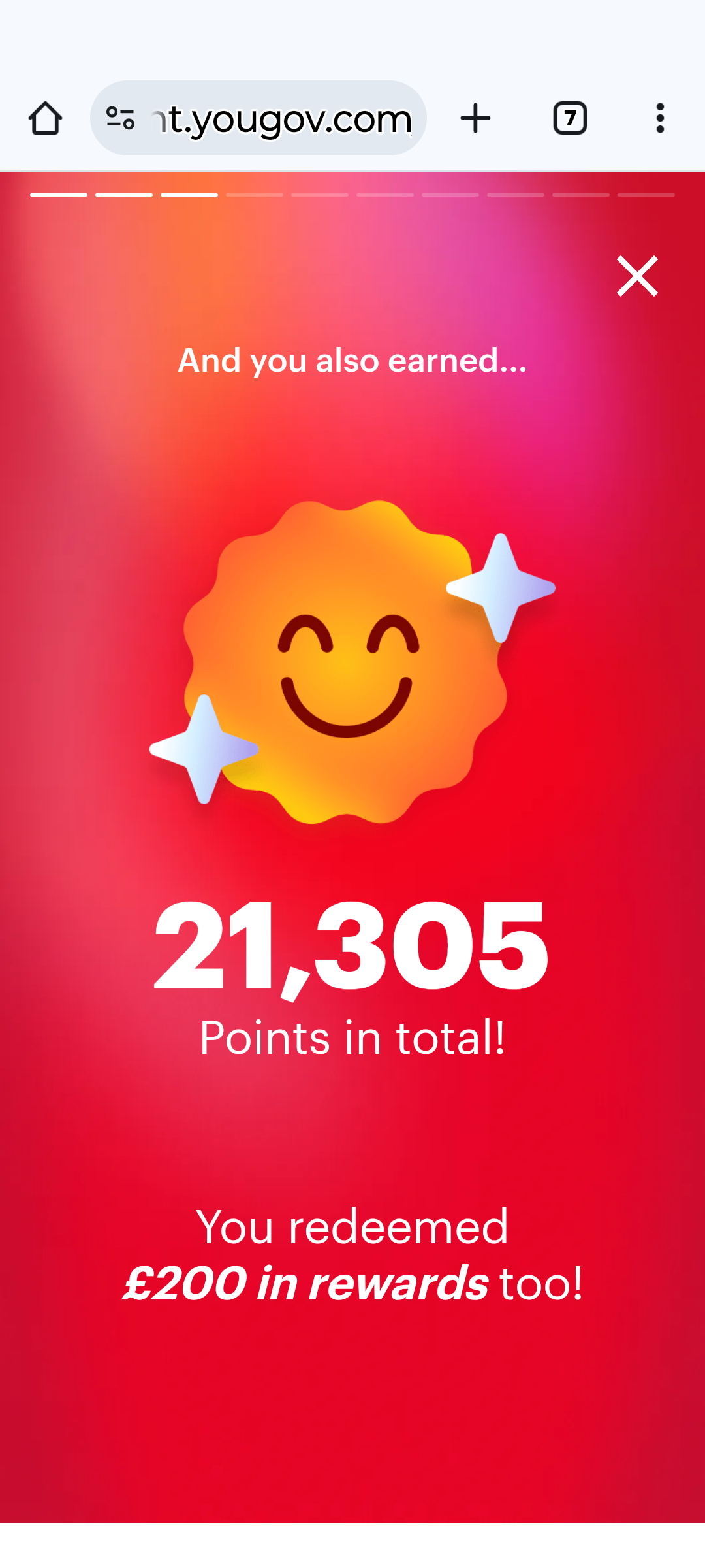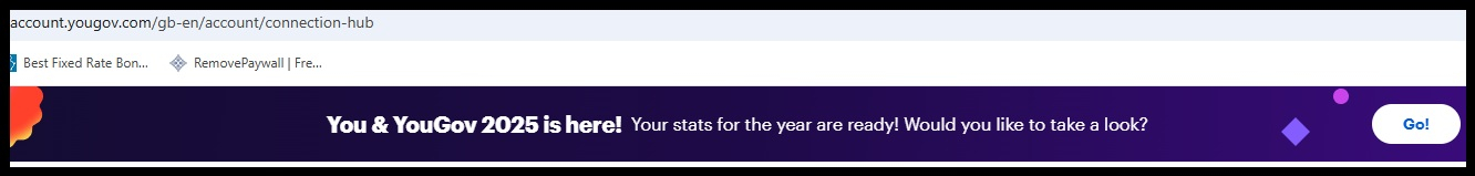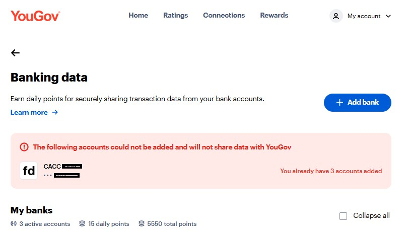 I think as part of the change to daily points from sharing bank data, the limit was reduced from 10 to 3 accountsreub075 said:Many thanks to @Bridlington1, @Band7, @Section62, @MikeJXE, @friolento, @Middle_of_the_Road and many others who have promoted YouGov points and rewards through this and other threads,I have benefited from being a member for almost three years, to the tune of a decent three figure sum over the three years - by completing surveys, connecting TV streaming services, Google, Youtube, and Banking data (10 current accounts or credit cards for 500 points per quarter year).But since YouGov Finance stopped the Banking data rewards, and then started rewarding 5p per connected account per day, I have only been permitted to register a maximum of three bank accounts, but I understand that others on here are fortunate enough to be able to register up to 10 accounts.