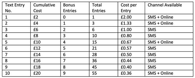 8. All entry options, tariffs and costs, including bonus entries are detailed in the table below. For any SMS text message entries, you may also incur a standard network charge for each message you send to us, to check this please speak to your mobile network provider.