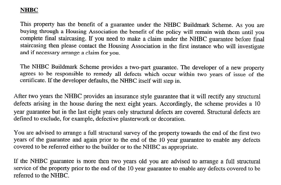 " Your builder will provide this initial warranty and agrees to repair defects that do not comply with NHBC's Technical Requirements. This would not include wear and tear or maintenance issues"1 -