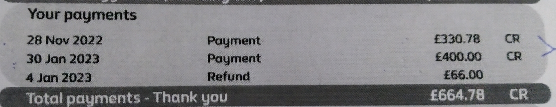 Hi, no we pay by Direct Debit £400 per month, then they swapped us to their new system and thought we where in credit and gave us the credit back, so we started in the new system with 00.00 Because they thought we paid to much, they adjusted our DD and took the 330.78. I discovered it and told them not to change our DD because we wanted to pay in because winter was coming... so they messed up [as usual] and did not take December... and took the 66 out of what we paid in!EssexHebridean said:So you usually pay £730 over this period, but they have only taken £664 - is that right?