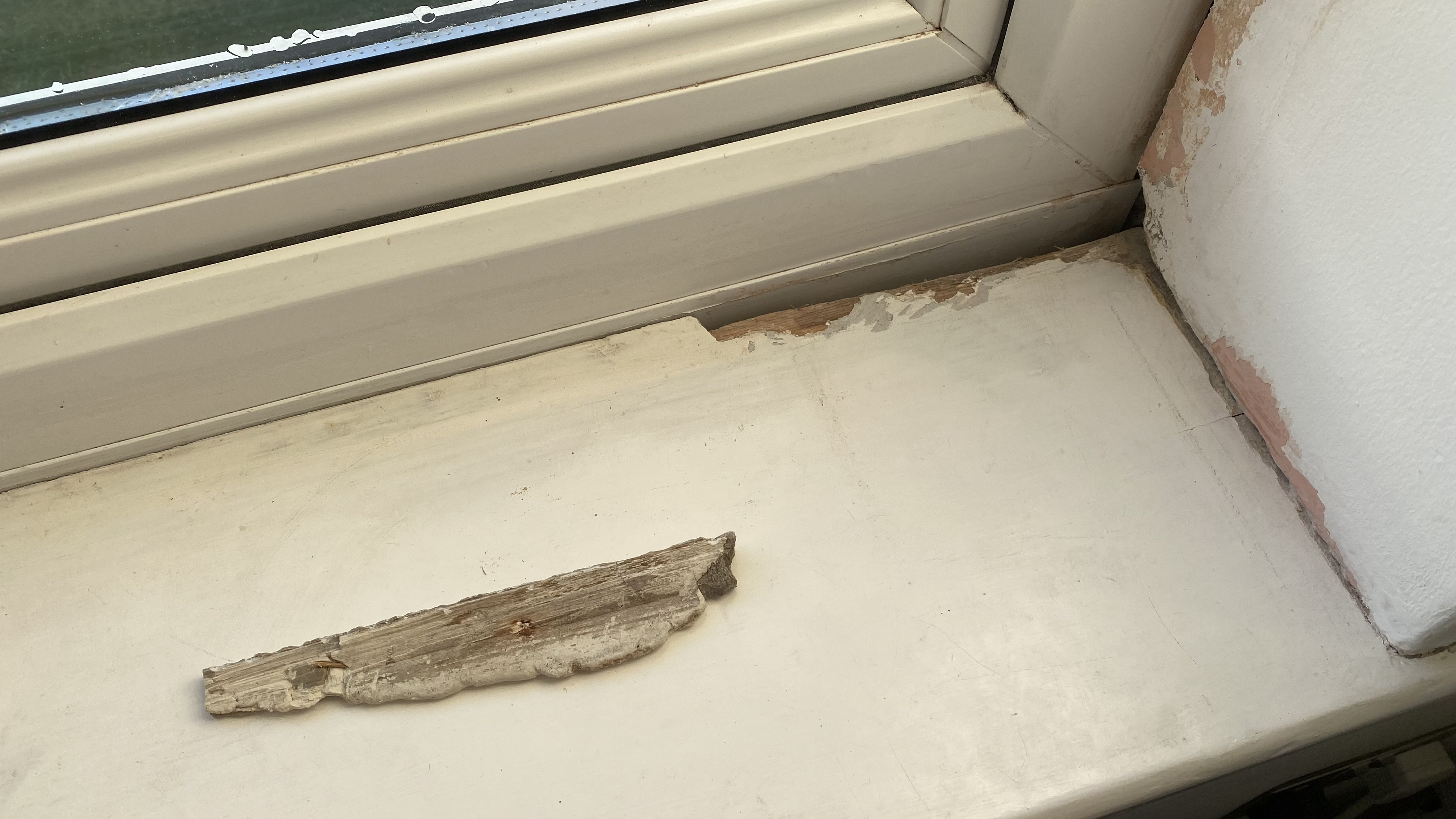 However, this area of the sill has come away. I think there must have been a split in the wooden sill here prior to me filling... and after much contract, expansion and maybe even a little of the nearby wall area damp, it'll just pulled apart. But mostly, I think this has happened because the wood was already split.