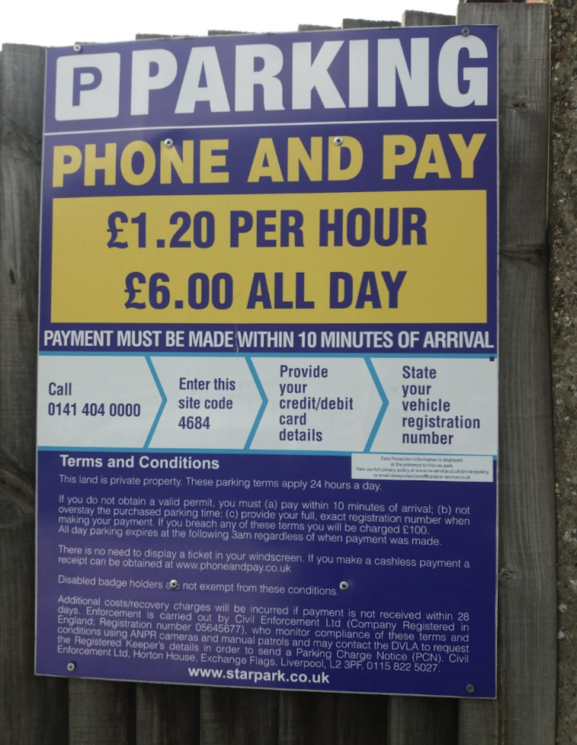 The signage states four steps to phone and pay: call the number, enter the site code, provide your card details and provide your vehicle registration number.