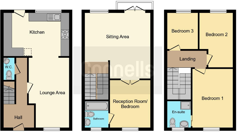 Normally the downstairs study and bedroom would be the bathroom and small kitchen, then one large master bedroom upstairs and two smaller ones. It's a pretty standard layout for lots of 3 bed terraces that were built around that time. The original back wall would be where the front wall of the lobby is now ( often a lean to sort of extension on the back )0 -