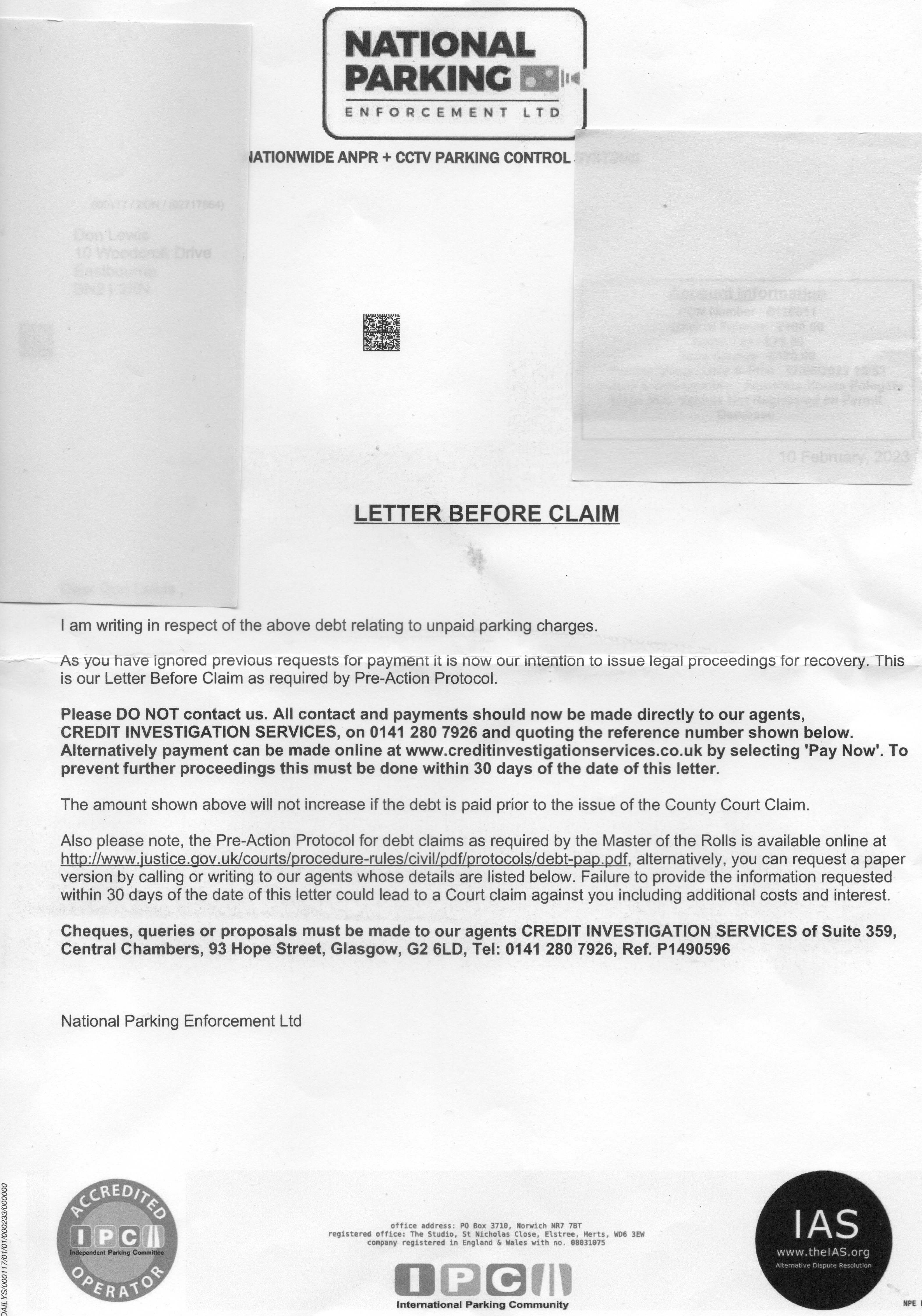 I have just received a “letter before claim” for an unpaid parking charge from National Prking Enforcement (asking that any replies should be addressed to Credit Investigation Services.). The event occurred 8 months ago and after their initial rejection of my appeal I have ignored the various letters threatening legal action.