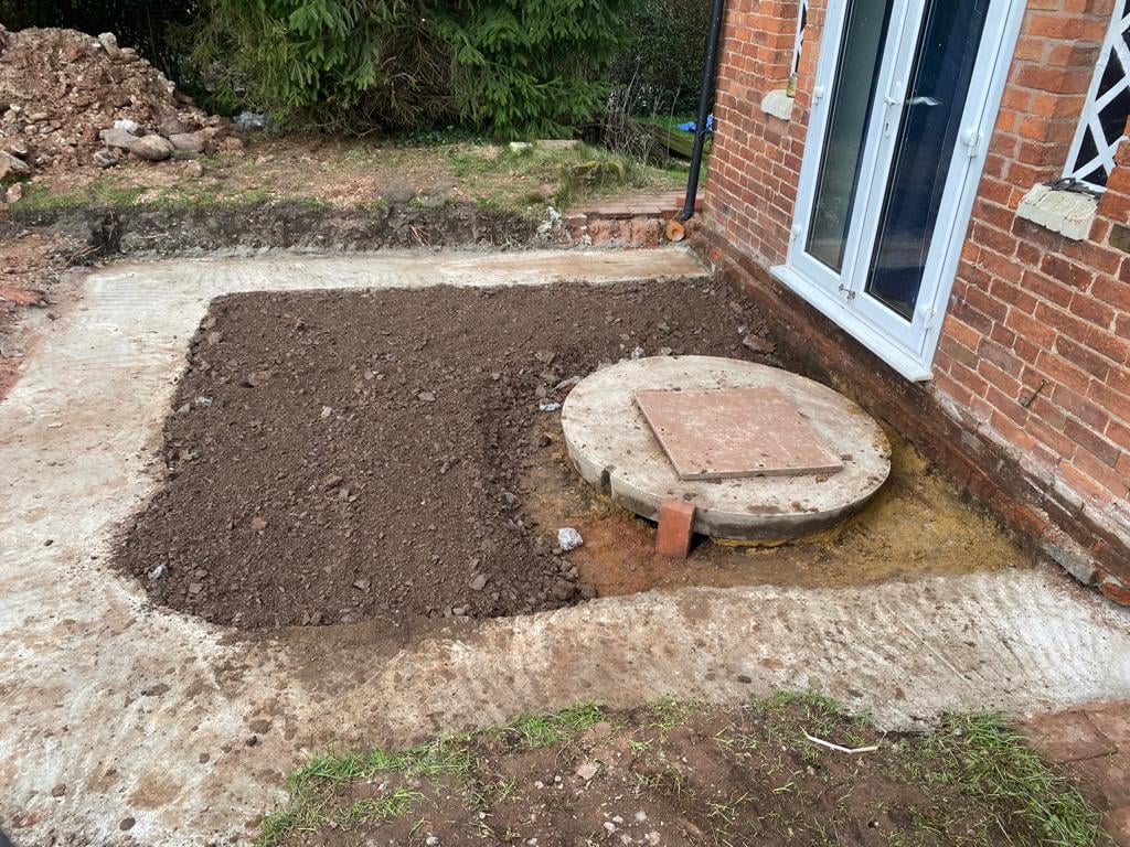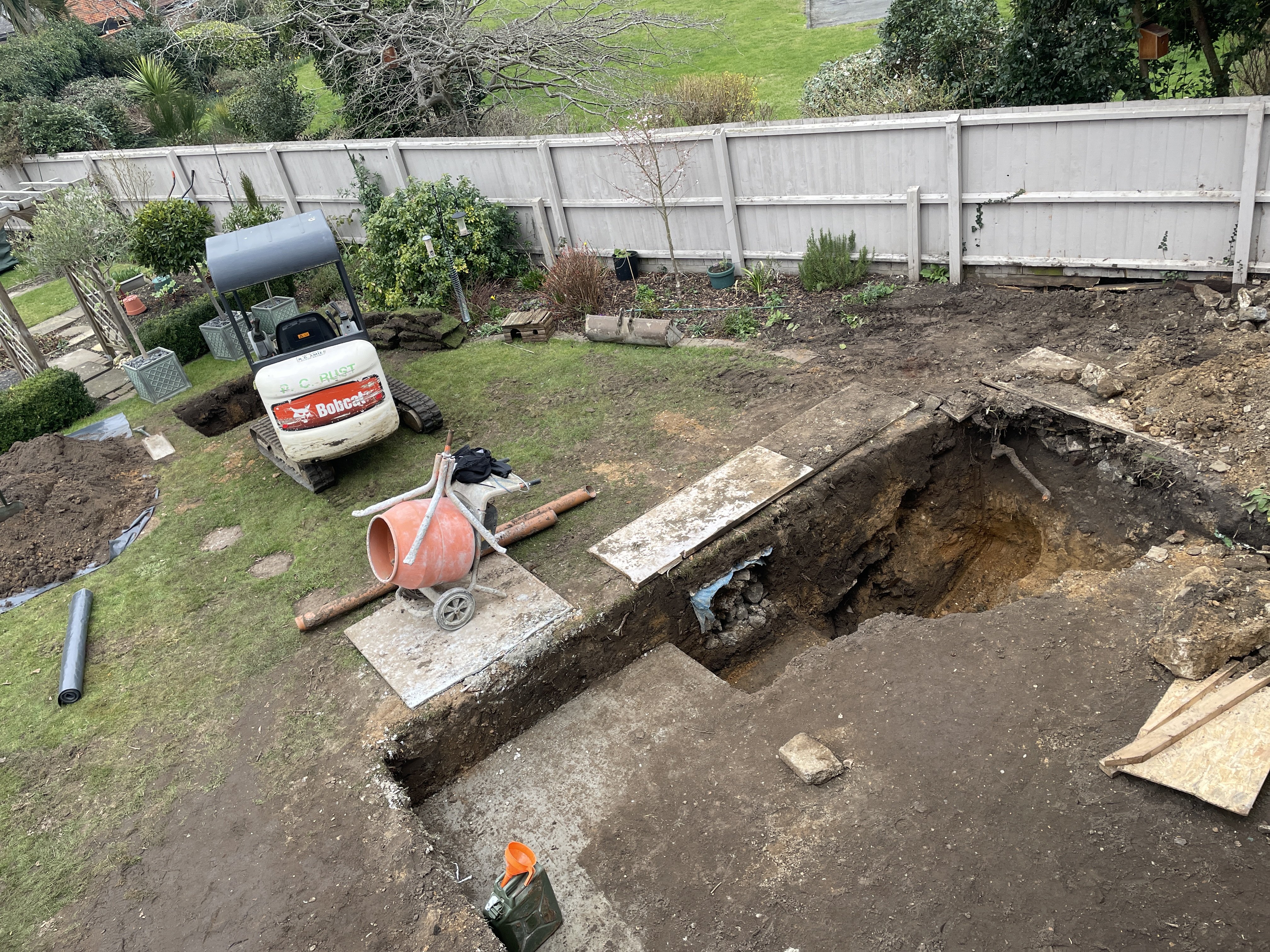 This is the well we found. Right in the wrong place. Had to have a reinforced concrete beam to get over the top of it. Where the blue plastic is, we also uncovered the soakaway, hence hole further down the garden.