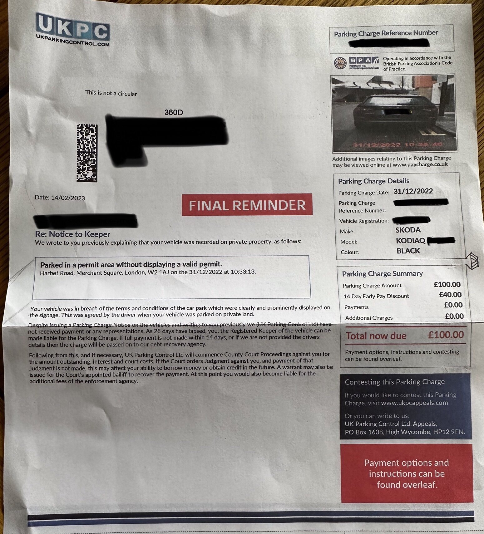 It’s funny that while I’m trying to solve a court case claim from UKPC against me, received another unfair parking charge from them! Which actually my partner was a driver and parked in the private road next to the place she’s working on Sat 31/12/2022.