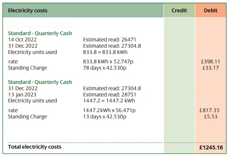 I'm totally confused by it and all i get from Scottish power is how would you like to pay!Your last few updates have been talking in pounds.The only suggesting I can make re the double or even treble billing - is add any costs - bank overdraft etc - to the or a formal complaint.I couldnt base anything on the actual £ amounts - on your spreadhseet - without trying to backcalculate usage after Dec 31 reading - and by correct - you do mean based on all the right readings ?But just based on the above bill - that new pink £1132 ex VAT shown for electric to 24 Feb - is c2.5x the amount above for Oct-Dec (£430ex vat).So potentially (c£700 ex VAT in c55 days - £430 inc VAT in previous 78 1130 total). £700/55 = £ 12.72 per day - £430/78 = £5.51 - so over twice the daily units ?Neither your orginal 2 bill amounts appear - but there is a cancelled £649 - was that right - meter reading wise - and just replaced by the much higher 24 Feb end date bill - or just cancelled as wrong again - as thats almost £480 below the £1132 - for 5 weeks ?So are you happy that 24th Feb bill is now a real reading and real charge bill ?Have you started formal complaint proceedings - about that initial inaccurate bill (not the 400 - the 817) . As if being rebilled - assuming you are in some contact (or just managing to submit a reading online ?).Or are the revised bills - cancelling costs and SP dropping credit threats etc.Thats not the same as just asking an operator - to look into it - or accepting the need to call back if they say the systems down - or cannot get through.That's actually saying something like "I want this recorded as a formal complaint" or accepting to do so if they offer - of if cannot as "system down" - actually starting a formal complaint direct by say emailing SP.Given the debt charges etc it looks like you are on the road to a precarious situation - I would go straight to email - if not already started - or have these now also been refunded etc.Same with repeated bills for same periods etc. They should cancel when reissue.The time has defintely long since gone for e.g. waiting for 2 week call backs - or tolerating their "system down" failures to help - as some of your other earlier posts - it really isn't helping you.If not real readingsAny manual readings, times / dates etc of attempts to talk to them or actually talked to them, unsuccesfully etc will help them process the complaint.1) Error on Jan 13th Usage BillAnd take more readings now - ideally with photos - to build up you actual usage profile.We had to submit 2 a month apart to help convince BG of their bad estimates.As I say just getting worried as you have had charges and credit agency contact.By the way - can anyone confirm that would have halted once in formal complaint process ?(BG never threatened when had problems with mums account - despite actual famly readings sent and professionally taken - 18m of estimates - she was too trusting to check and unfamiliar with bills - the (E)s meant nothing to her)As you know by now the 13 Jan estimate is silly. Like out by over 1000 units.The 1440 over 13 days - over 100kWh a day - cf 10kWh/actual (yes?) before Xmas.Given you confirmed on 22/2 they other 2 were real manual readings - yes14th Oct and 31st Dec when they were entered onto the website. They are correct and they sent a bill out on the 15th Jan which I paid £398.11And even more so when you stated on 22/2The actual readings now are 27485. There is nothing else after that just ways to pay, where your energy comes from, and how much you've used compare to last year.If that was the reading on the 22/2 - there's no way it could have been as high as 28751 on the 13th Jan.You unfortunately seem to have gotten into a big initial delay - by worrying about not getting your 13th Jan or so reading in right away.As another post - any dates reading - like the 22/2 one - would have helped.As another post - you have been overbilled for c1300 units - as at 10kWh a day - it would be more like 130 Units - not 1440 for 13 days. Charitably say 200 units used.Again as another poster has already pointed out - page 1 states 13 Jan = 27451 - far more reasonable but still probably too high - pretty close to your 22/2 figure.2) The tariffsDid I read those right - the two pages with the usage etc 833/14x0 - uses rates of 47.747 and 56.071 - the other uses 52.747 and 56.471.But the tariff name is the same.3) Weird - but perhaps SP normYou are definitely getting the EPG discount - just not in the way I would expect - given a change in Ofgem and EPG figures.From Ofgem announcment for Jan 1st"From 1 January the equivalent per unit level of the price cap to the nearest pence for a typical customer paying by direct debit will be 67p per kWh for electricity customers and a standing charge of 46p per day. The equivalent per unit level for a typical gas customer is 17p per kWh with a standing charge of 28p per day. "The pay on bill (standard credit) around 3.5p more - but regional average so would expect a gross rate c70+/-Xp - from Jan 1st - on billing - and the higher 31.84p discount.But they appear to be sticking to sum mixed adjustment - keeping the old discount level - is born out by checking use and the value statement on the EPG refund on the bottom of the full p3 of 8 page