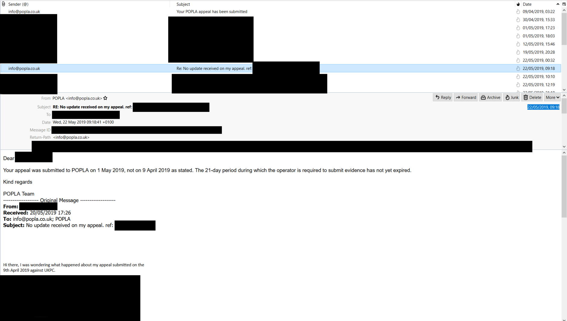 Found my images of the email where I started the appeal on the 9th April 2019 and chasing them on the 22nd May 2019