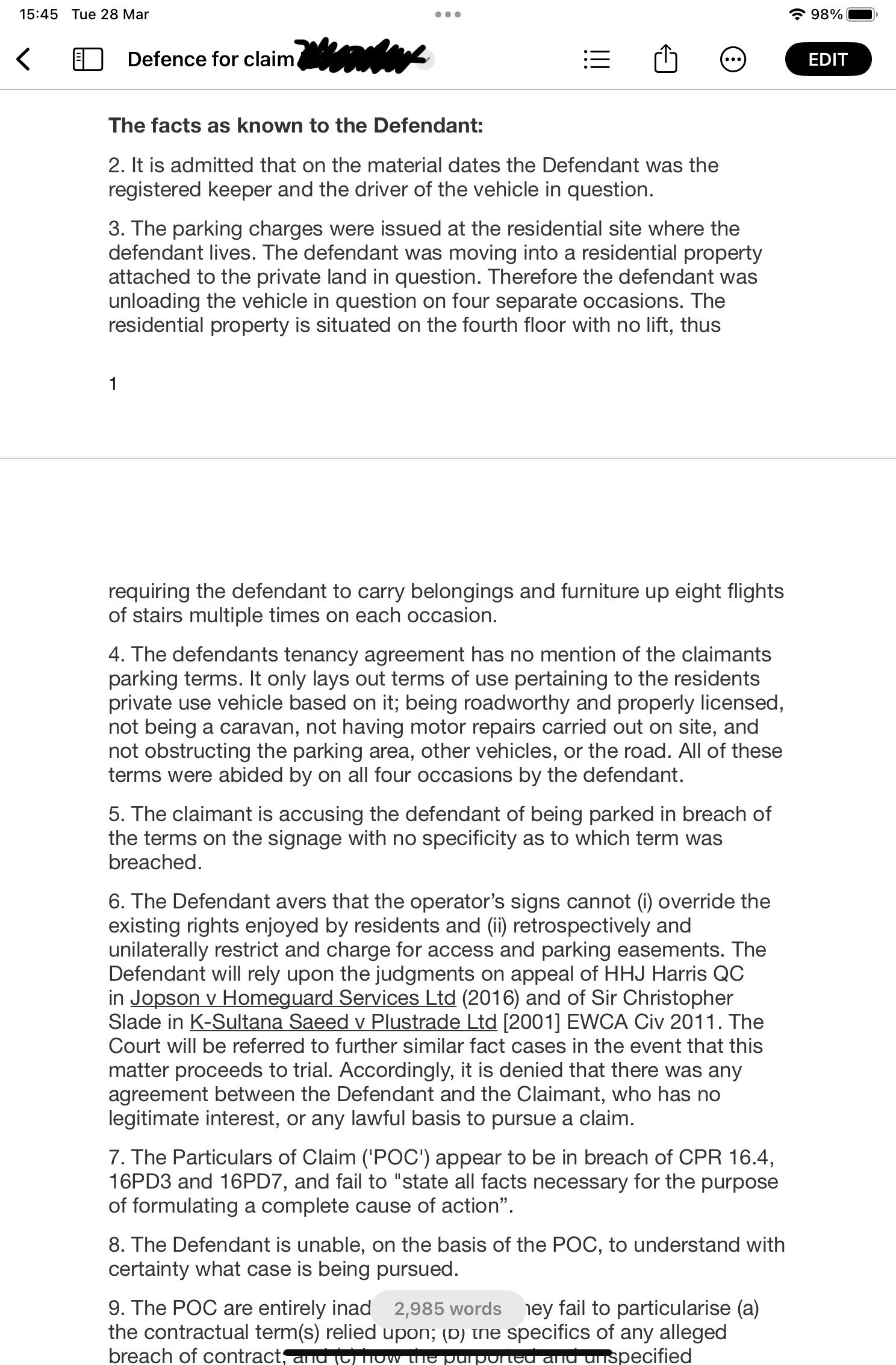 7. The Defendant avers that the operator’s signs cannot (i) override the existing rights enjoyed by residents and (ii) retrospectively and unilaterally restrict and charge for access and parking easements. The Defendant will rely upon the judgments on appeal of HHJ Harris QC in Jopson v Homeguard Services Ltd (2016) and of Sir Christopher Slade in K-Sultana Saeed v Plustrade Ltd [2001] EWCA Civ 2011. The Court will be referred to further similar fact cases in the event that this matter proceeds to trial. Accordingly, it is denied that there was any agreement between the Defendant and the Claimant, who has no legitimate interest or any lawful basis to pursue a claim.I have attached a screenshot of the parts discussed/amended. and I’m assuming this is now ready to send. I’ve signed and dated the bottom and will email it over. Then I will post updates on here as and when I get them!