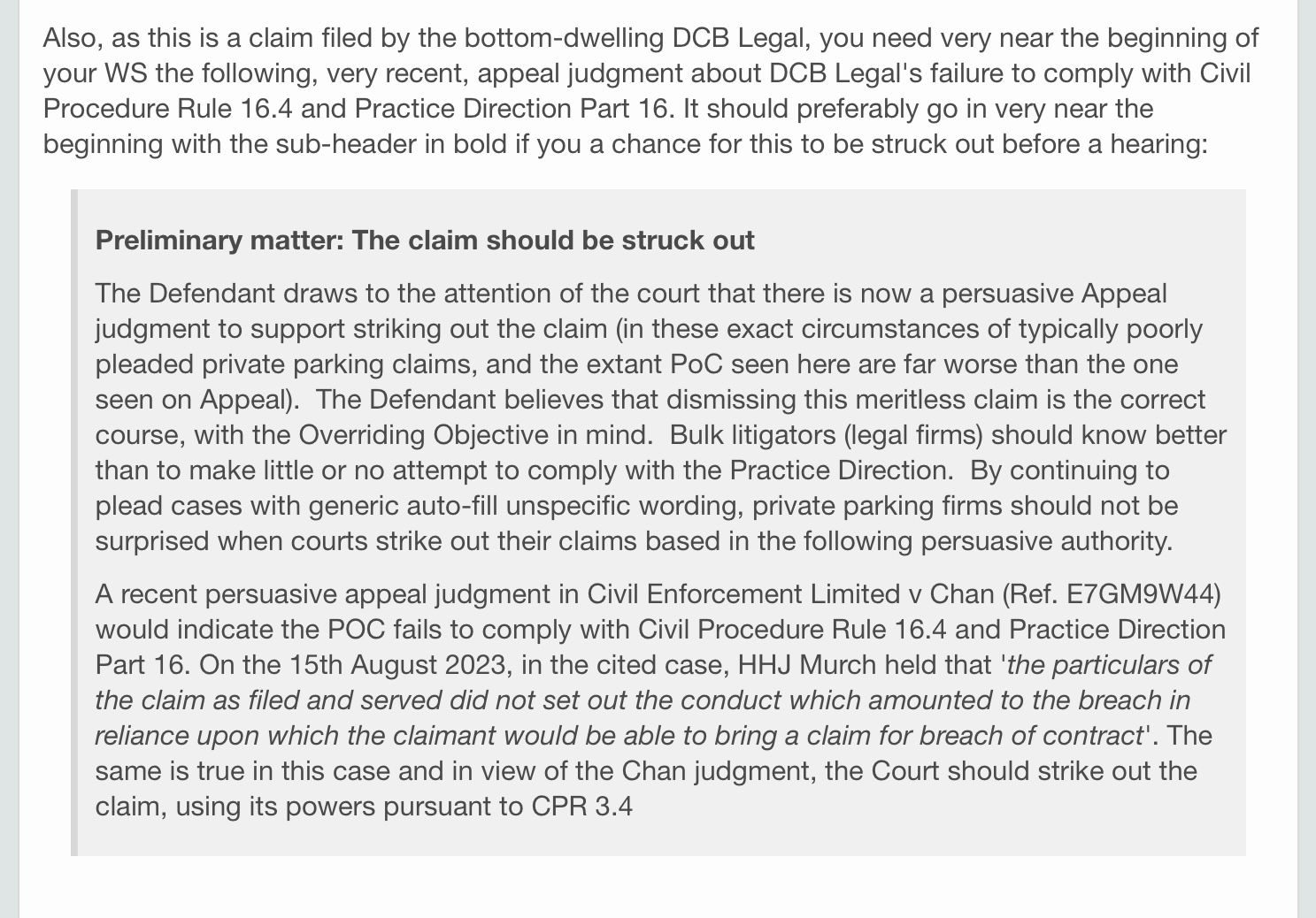 Also I’ve seen that the below section should be added to a witness statement in cases against Ukpc/dcb legal. But I’m unsure if this applies to my situation as I don’t fully understand what it means. Is it referring to the unspecific wording on the signage, or their regurgitated arguments when pursuing the defendant through the courts? If the latter, I’d say their witness statement seems to be quite detailed and specific and addresses every point of my defence so therefore wouldn’t apply to my case.