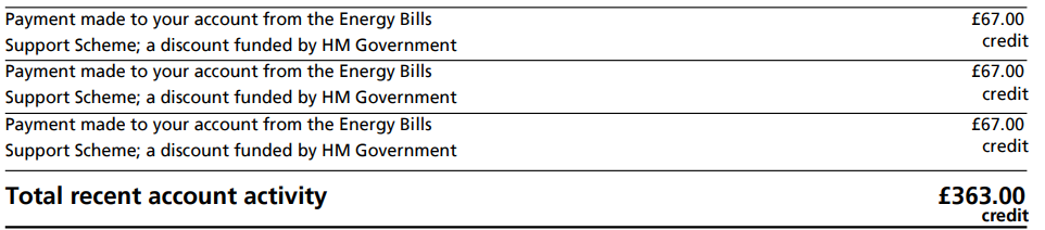 I thought that, but I think that we need to see how the EBSS payment of £333 has been applied. Looking at what has been posted it suggests that £333 has been refunded from the account credit balance so where is the balancing £333 from the Government?TheElectricCow said:I do a lot of work around customer accounts/billing in my day job, easiest way I find to look at it is like this: debits are positive numbers, credits are negatives. A refund would be a positive on your energy account because they have to take that money off (debit) your balance in order for it to be credited to your bank account.