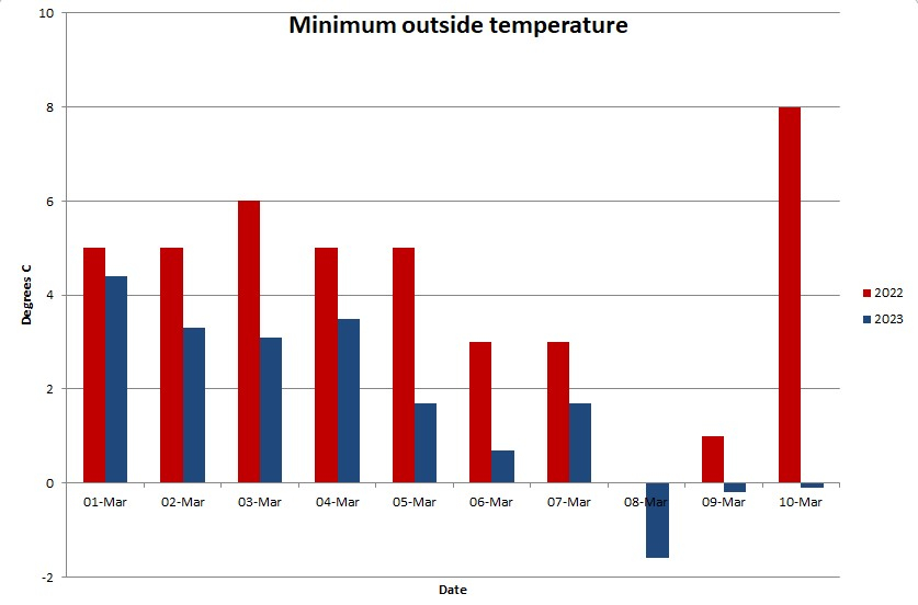 Looking back at my Hive data which shows the (averaged in some way?) highs and lows for each day then the first couple of weeks of March last year were warmer, in particular the overnight lows didn't drop anywhere near as far staying around 6 to 8°. And as Alnat1 says there was a lovely warm spell in the last 8-10 days with highs of 15 - 17 showing on the app (which probably translates to 20°-21° peak) during the day.We used just over 1400 kwh of gas last year (down 40% from previous March) but, unless it warms up again, my energy recording app is predicting we'll be back over 2,000 again this year sadly.