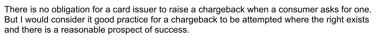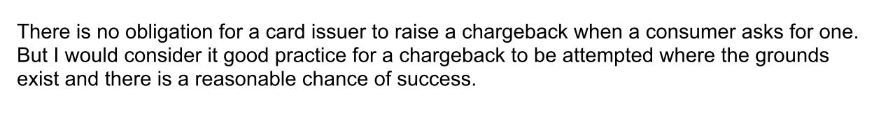 If taken to the Financial Ombudsman they think it's good practice for a bank to try a Chargeback before S75 if there is chance of success.Manxman_in_exile said:I don't think it would be reasonable to expect any ordinary person in the street not to be rather worried about being sued - with the possibility of losing and getting a judgment against them - because they were going to rely on s75 to extricate themselves after the fact. We've seen at least one OP give in and pay up in this sort of situation before.