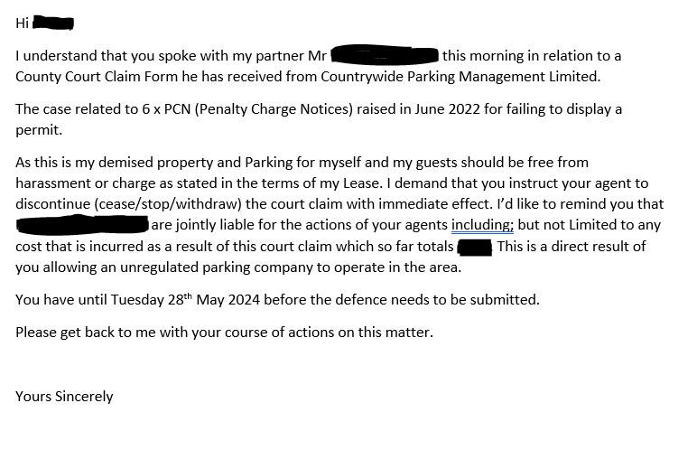 Hendolad said:Thanks, So my line of defence should be that, a) the car was legally parked under the terms of the lease (Insured and Mot'd or roadworthy and permitted by the lessee),Possible changesa) the car was legally parked under In accordance with the terms of the leaseHowever, if it hasnt already been done: you need to get onto the management agents and demand that they instruct their agents to Discontinue ( cease/stop/withdraw) the court claim with immediate effect, reminding them that they are jointly and severally liable for the actions of their agents including, but not limited to any costs you incur as a result of this court claim which so far total £XXX (£16/hour or part thereof multiplied by X number of hours) and this is a direct result of them allowing an un regulated parking company to operate in that area