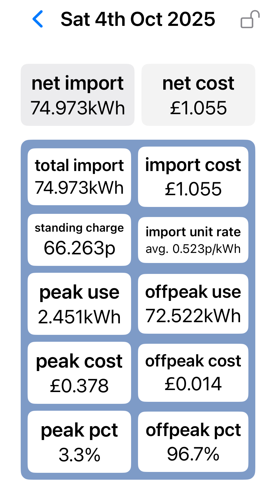 Yesterday ended up at 45.59 kWh for -13p. Today (so far) is 20.78 for -14p. Currently exporting, but continuing to do endless laundry (there was a backlog due to a bedroom being emptied for renovation, and lots of grubby pet bedding and towels), using the immersion, filling the battery, and using electric heating should help me maximise the benefits AND mean the laundry mountain is gone. @EssexHebridean - I'm not going to risk putting the washing on the line, as I think it will probably blow away!0