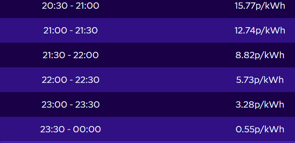Yeah, the 22:30 is always interesting, I do wonder if there's some extra formula used for that slot as it often indicates prediction for the coming night - and when you compare average yearly slot of 22:30 and 23:00, the first one is a few pence cheaper (but it could be that estimation 30.5h ahead is much worse than 7h).1 -