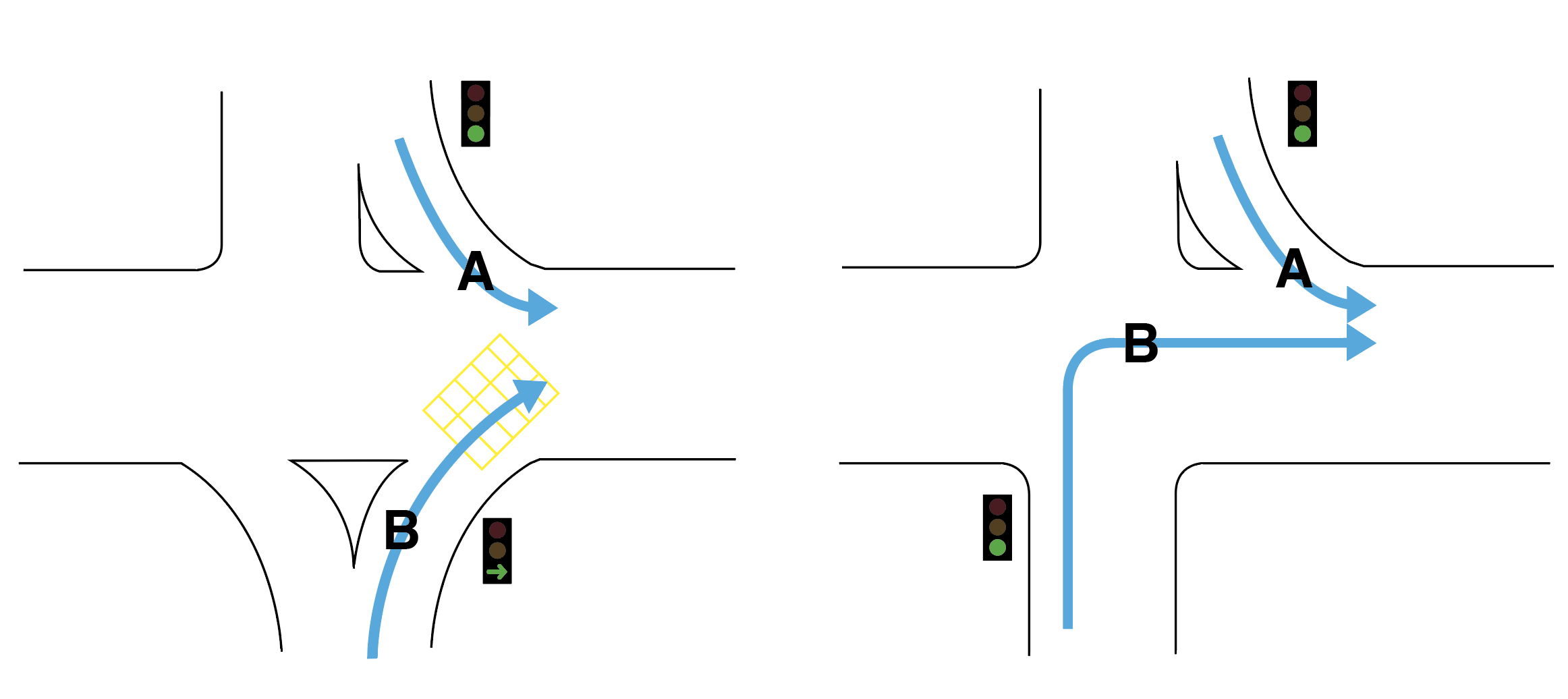 I think A has priority in picture one (LHS) and B has priority in picture two (RHS)