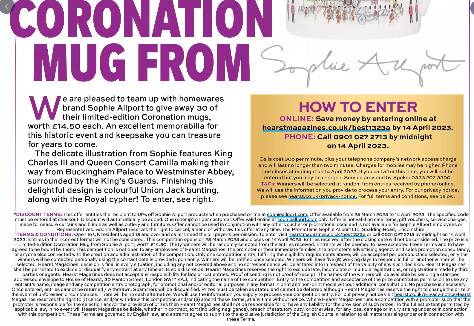The prize is a limited-edition Coronation Mug from Sophie Allport, worth £14.50. Thirty winners will be randomly selected from the entries received.