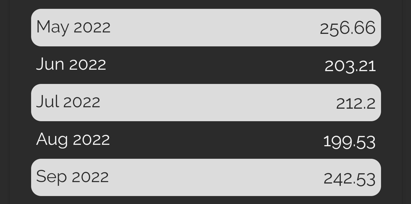 If we are doing averages we use 205 kWh a month in the summer and due to allergies that's using the tumble dryer 5-6 times a week. Washing machine 7-8 times a week. Fridge freezer inside (not American which can be guzzlers) and a seperate freezer outside. We also run the hot water on the Air Source heat pump 4-5 times a week in summer plus either heating or air con for the converted garage gym on the ait to air heat pump heater/cooler.