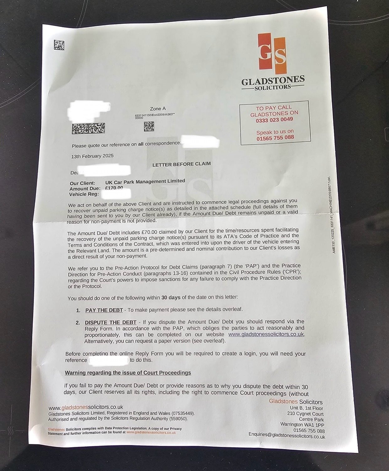 And finally, if Gladstones send anything other than "our bad, we're dropping this", you should also consider issuing a complaint to the SRA about receiving a LBC with no legal basis - they cannot possibly claim for a PCN that's been cancelled.3 -