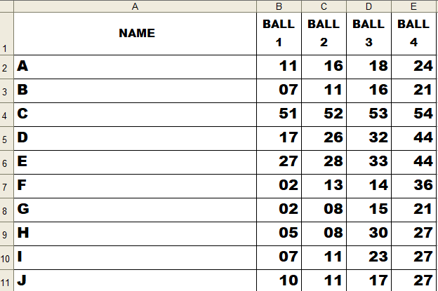 Thanks Facade, but there's no standard filter in 2003. My filter is a little different to yours. As you can see from the screenshot below, the number 11 appears a few times. It could even be in the column Ball 4. I want to filter every name where number 11 appears, which in this case would be A,B,I, and J.facade said:As advised use a pivot table, but if you want to use a filterI'm using libre office, which is a clone of excel 20031) jab the top left corner to select all the data (or run the selector over it all) you might not need to, you don't in libreoffice2) open data menu select standard filter, then pick what you want. Subsequent rows from the first can be ANDed or OR'dWhen I click OK only the titles and row d remain