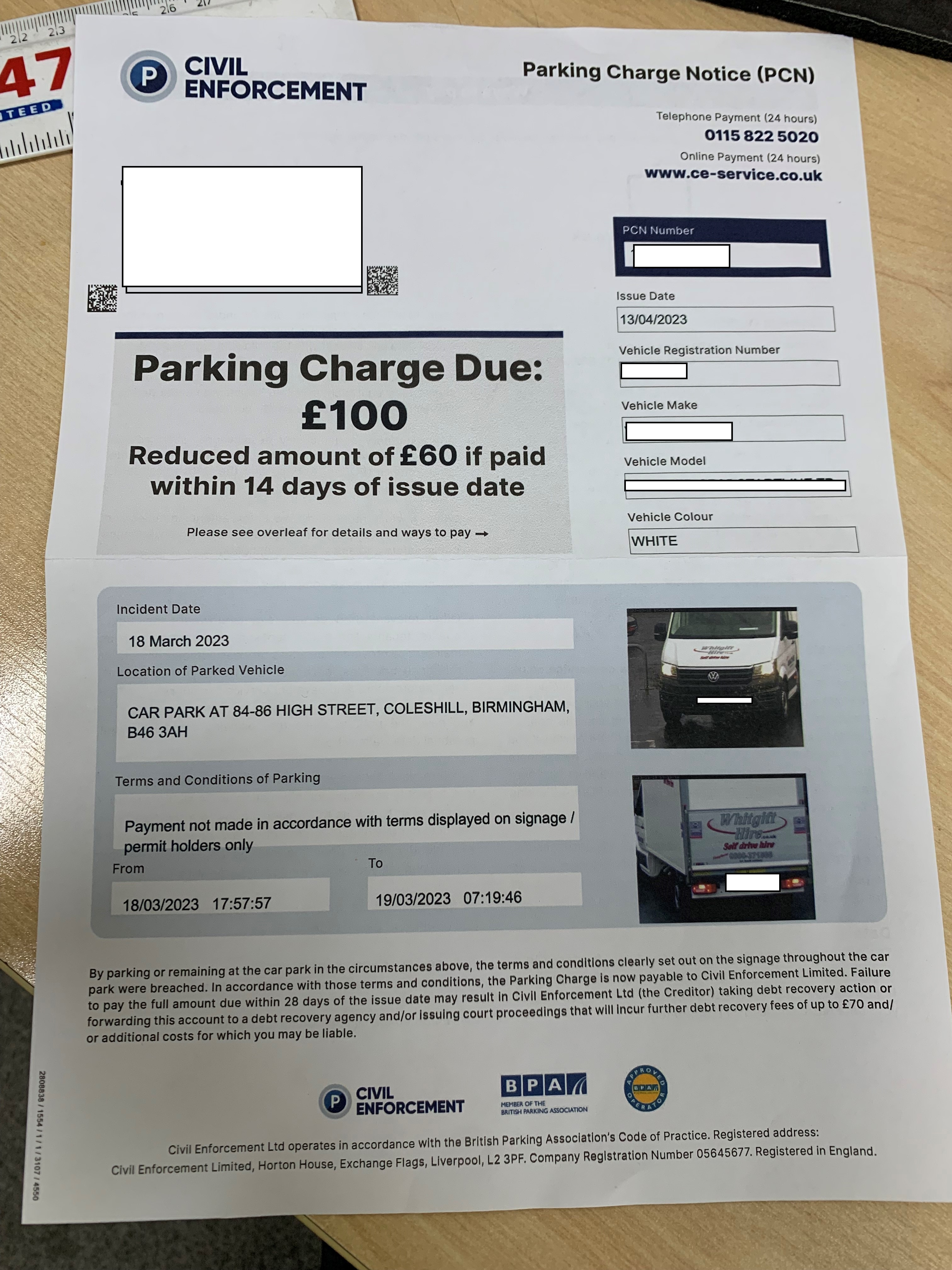 The back only states payment and appeal options to POPLA, all the standard stuff.
