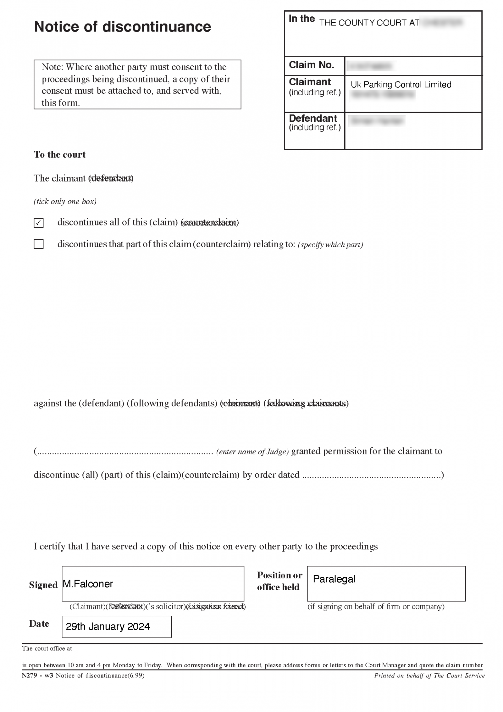 They have attached the Claimant’s N279 Notice of Discontinuance for my records.