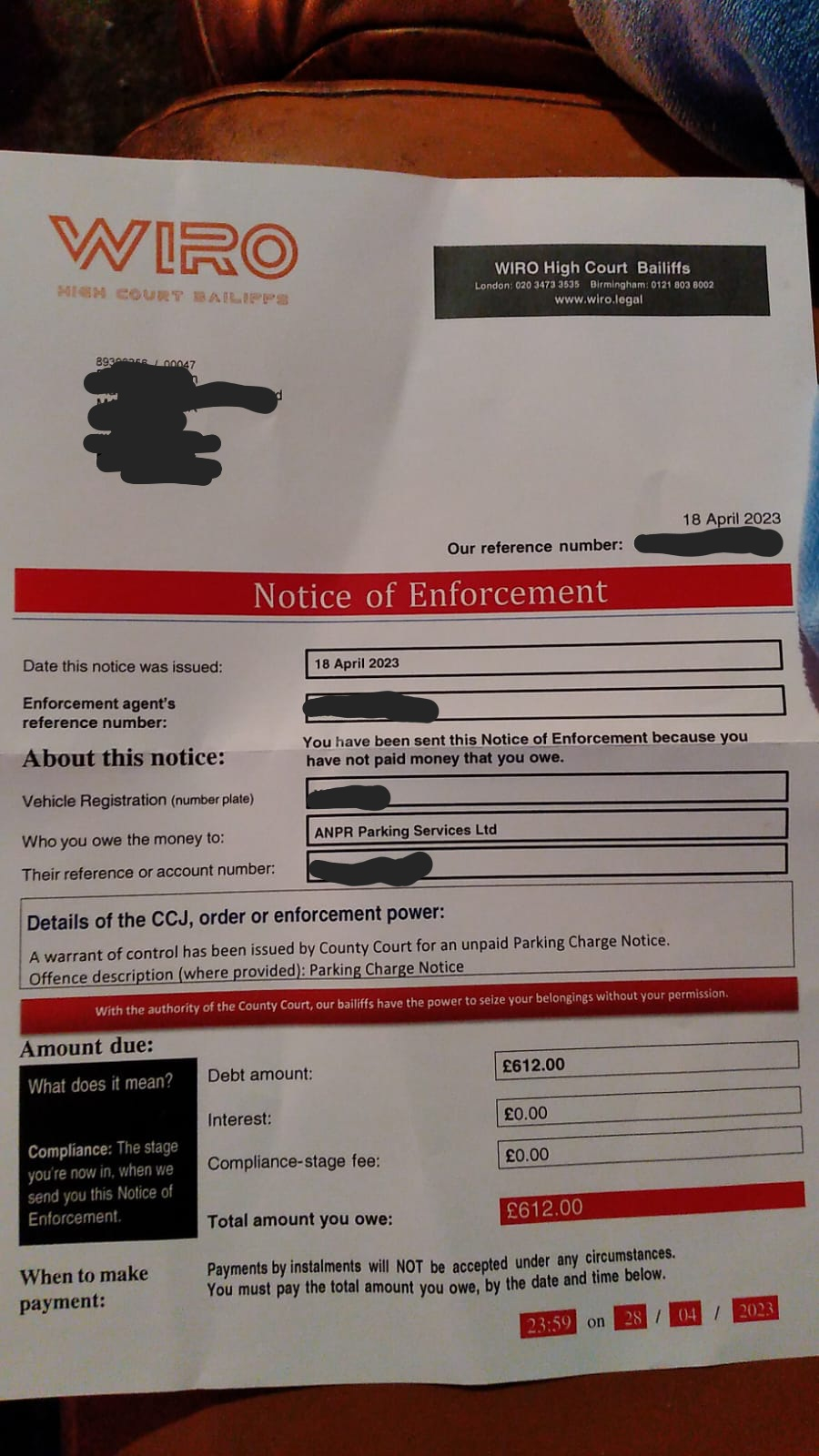 So I received a fake letter in which they say I owe money to ANPR parking services. I knew it was a scam as I applied for a courier job on indeed. I had to put my car reg in then indeed removed the job. These so called baliffs sent me an email aswell to my email I use for indeed. Reported to action fraud.