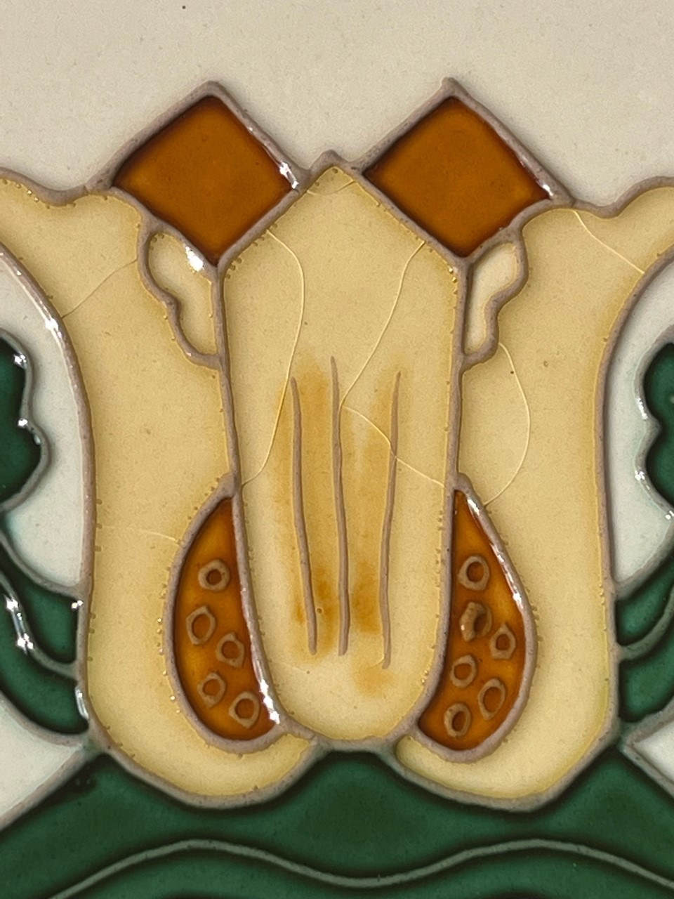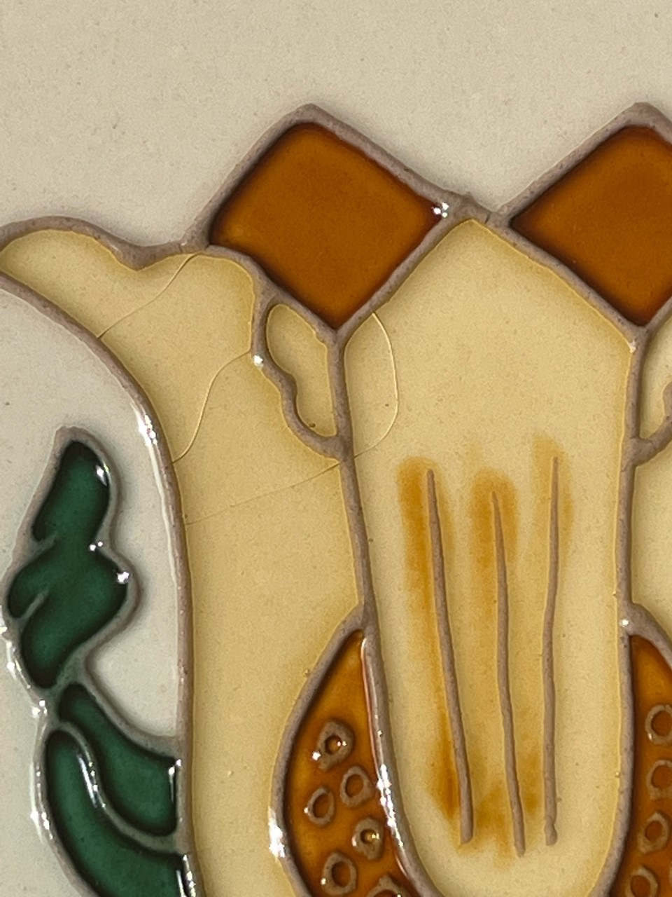 Looks like very minor delayed crazing, where the glaze and tile expand and contract at different rates during the kiln firing. It can develop over a number of weeks or months after production on any ceramic item. Those with multiple colours or depths of glaze (such as the piping between colours on this tile) are slightly more susceptible due to the multiple “fits” of the different colour glazes.