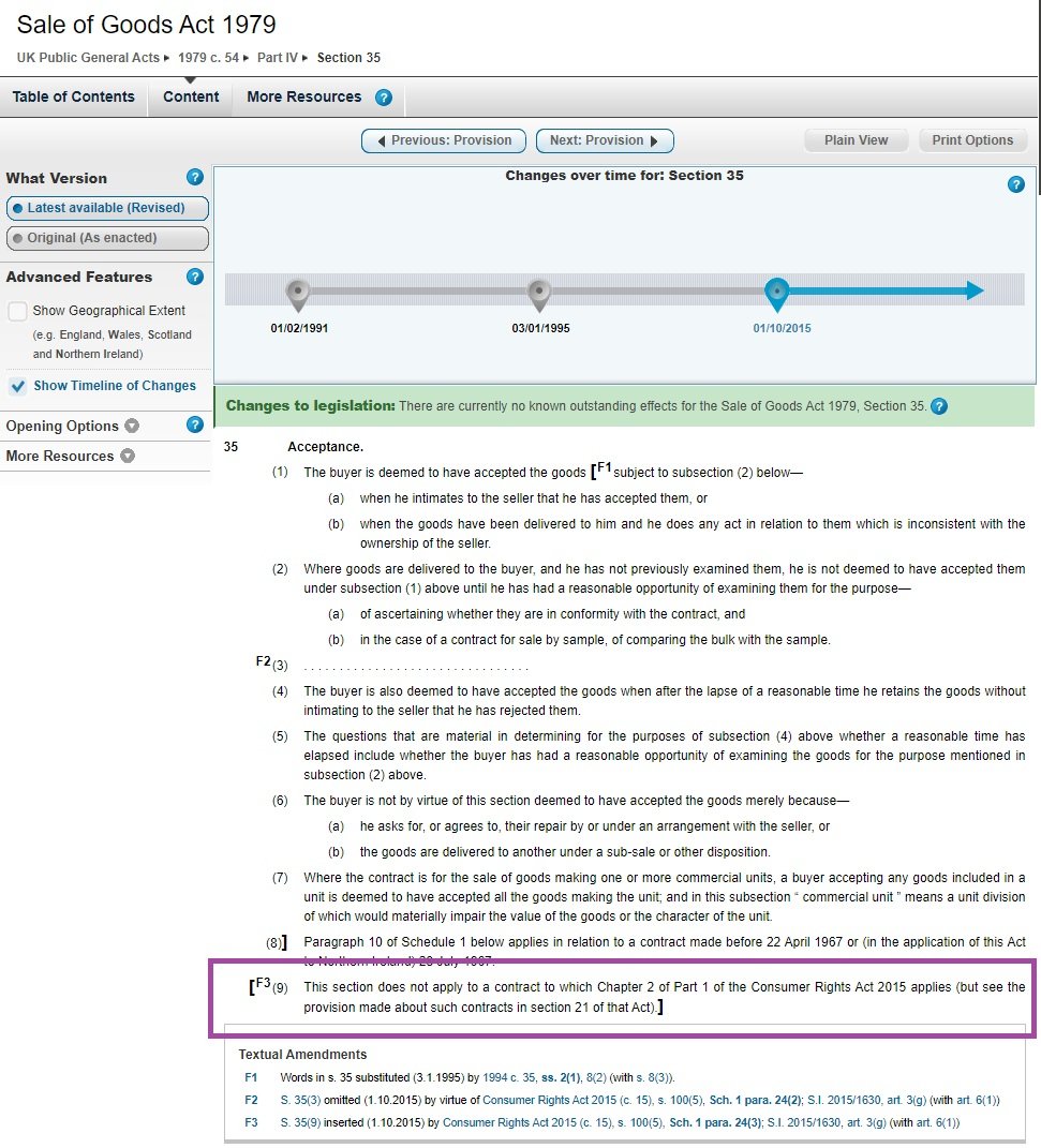 Sorry, but where does the current law say anything about "acceptance"? My understanding is that since CRA 2015 came into force the legal concept of "acceptance" no longer exists in relation to consumer sales contracts.bris said: