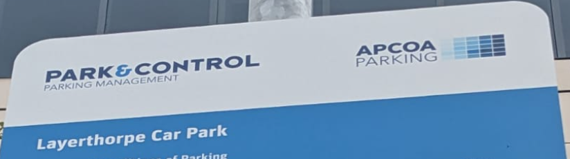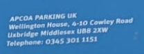 The sign says "Park & Control Parking Management" in the top left, "APCOA Parking" in the top right, and "APCOA Parking UK" in the bottom left. The only address and contact details (website and phone number) on the sign are under APCOA Parking UK. There are none for Park & Control. As far as I can tell there is an "APCOA Parking UK Ltd" I can find which is a separate company to "Park & Control (UK) Ltd".