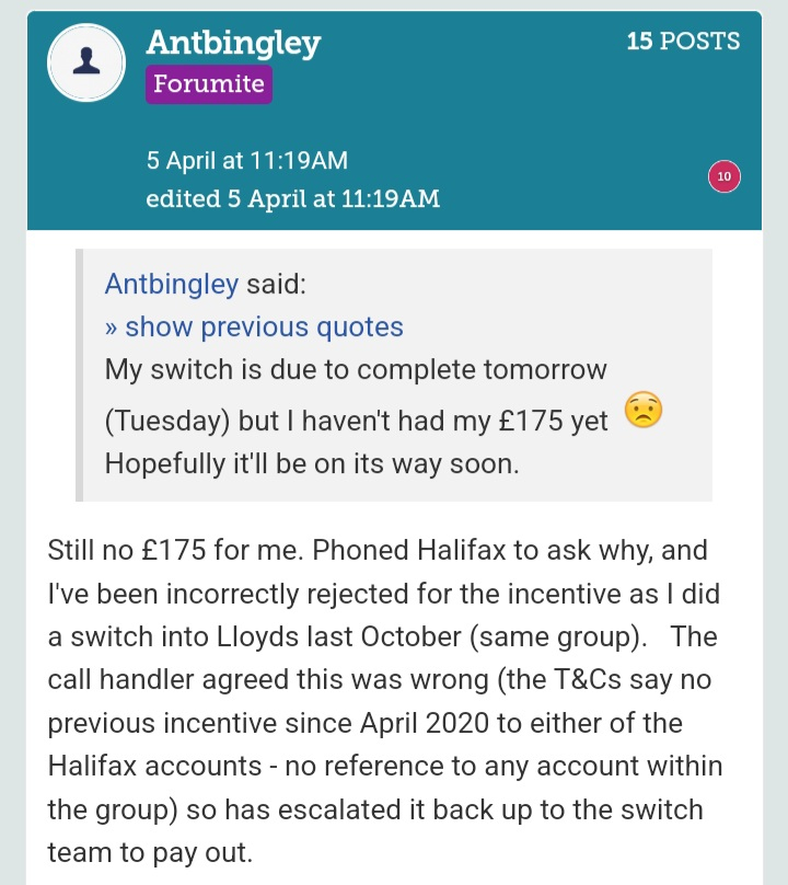 Me too bgr62. However my better half missed out & this looks like she’s excluded having received an incentive from Halifax last year. I presume this is a new condition? Does anyone know how on the ball they are across brands?0