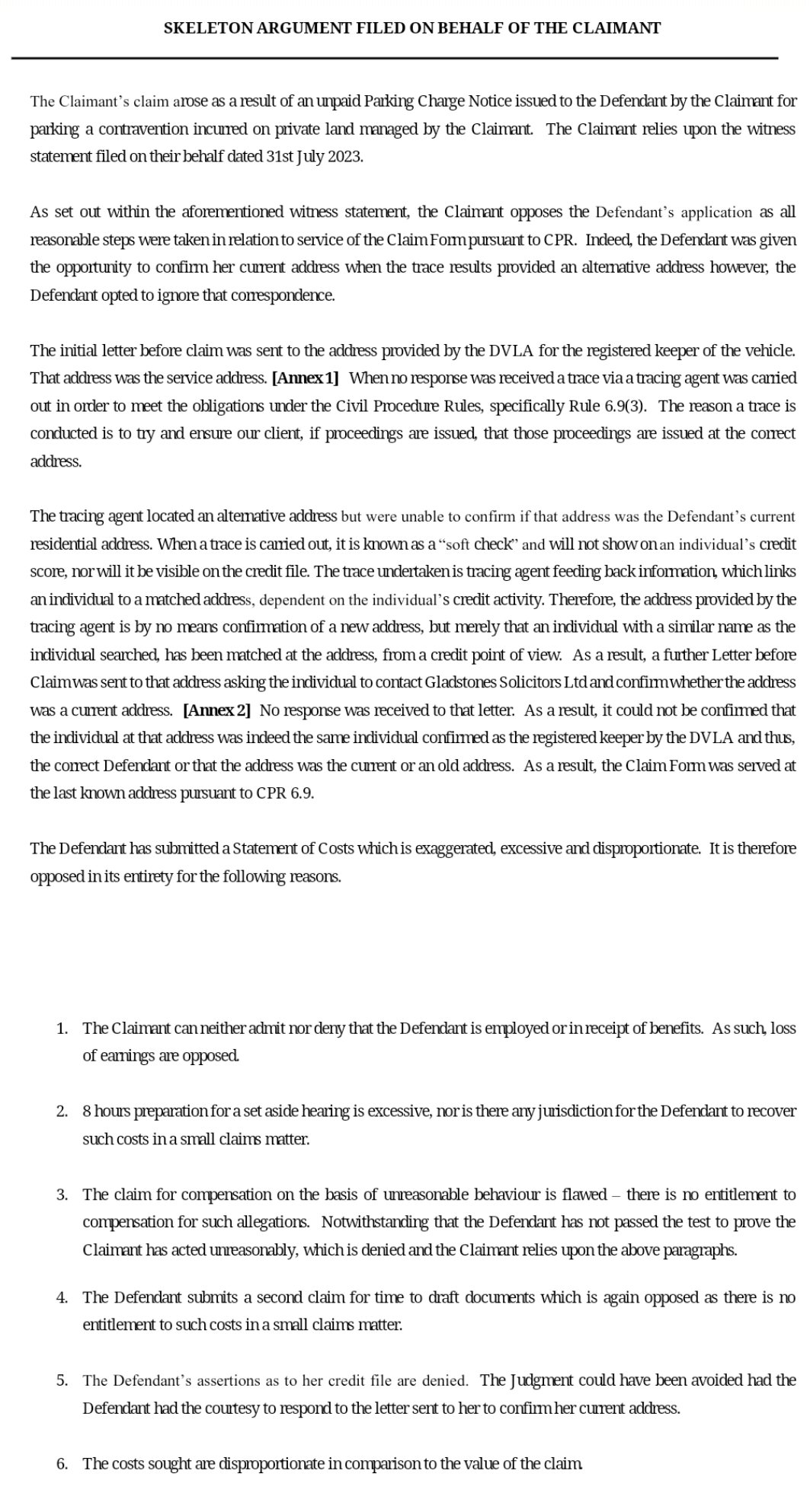 You do not sign a skeleton.The Claimant did not have any response from communications sent to XX but then filed a claim there anyway. In their witness statement, they report that they did not file the claim to the ‘possible alternative address’ as they did not receive a response, thus “that address could not be confirmed for GDPR purposes”. There is no rationale for why a non-response at XX did not meet those same criteria. Had the claimant completed the Experian search as claimed and found an alternative address, this would be the usual or last known residence of the Defendant for the purposes of CPR 6.9, as this search would have been completed after the DVLA request.