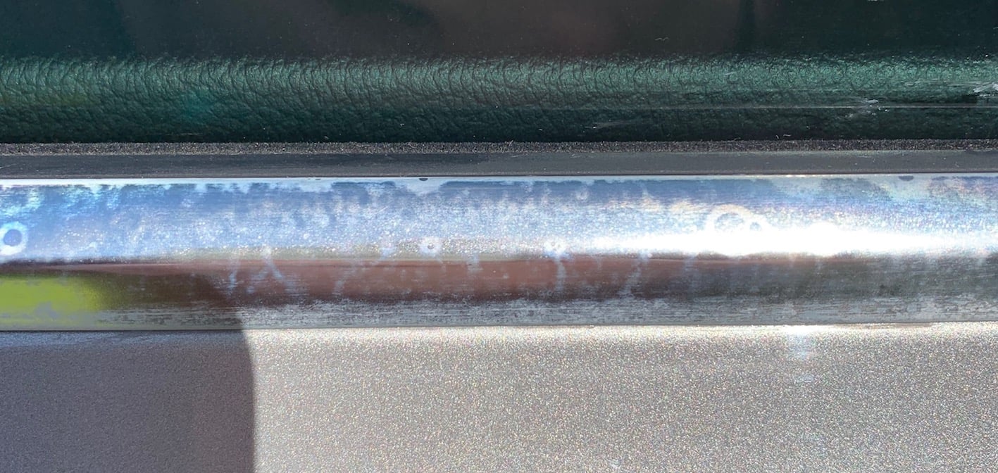 of the windows. Perhaps somebody washed the car and didn't dry it. My guess is that the trims are some sort of chromed