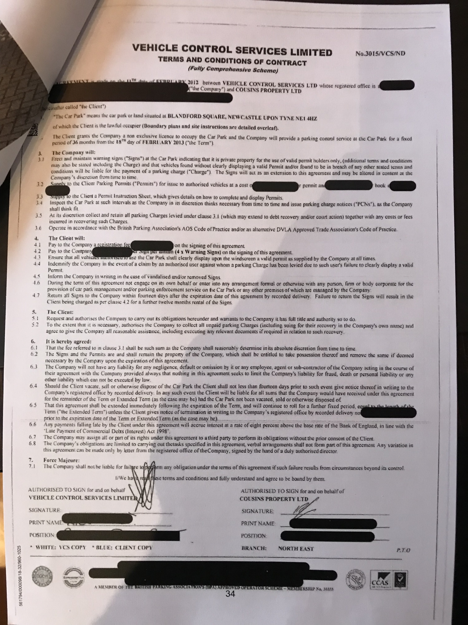 You have a point RE the contract end date. But I went to see the land owner and their own car park is ran by VCS which I why it looks feasible they have an agreement with them. This was sent on paper to me.Fruitcake said:There is no company called Cousins Property Limited registered at Companies House, nor has there ever been as far as I can tell. The company with which VCS are alleged to have had a contract does not exist, and never did. The company details, including Company Number, have been redacted, so there is no way of determining any other conclusion other than that VCS did not have a contract with a registered company that had the authority to trade.