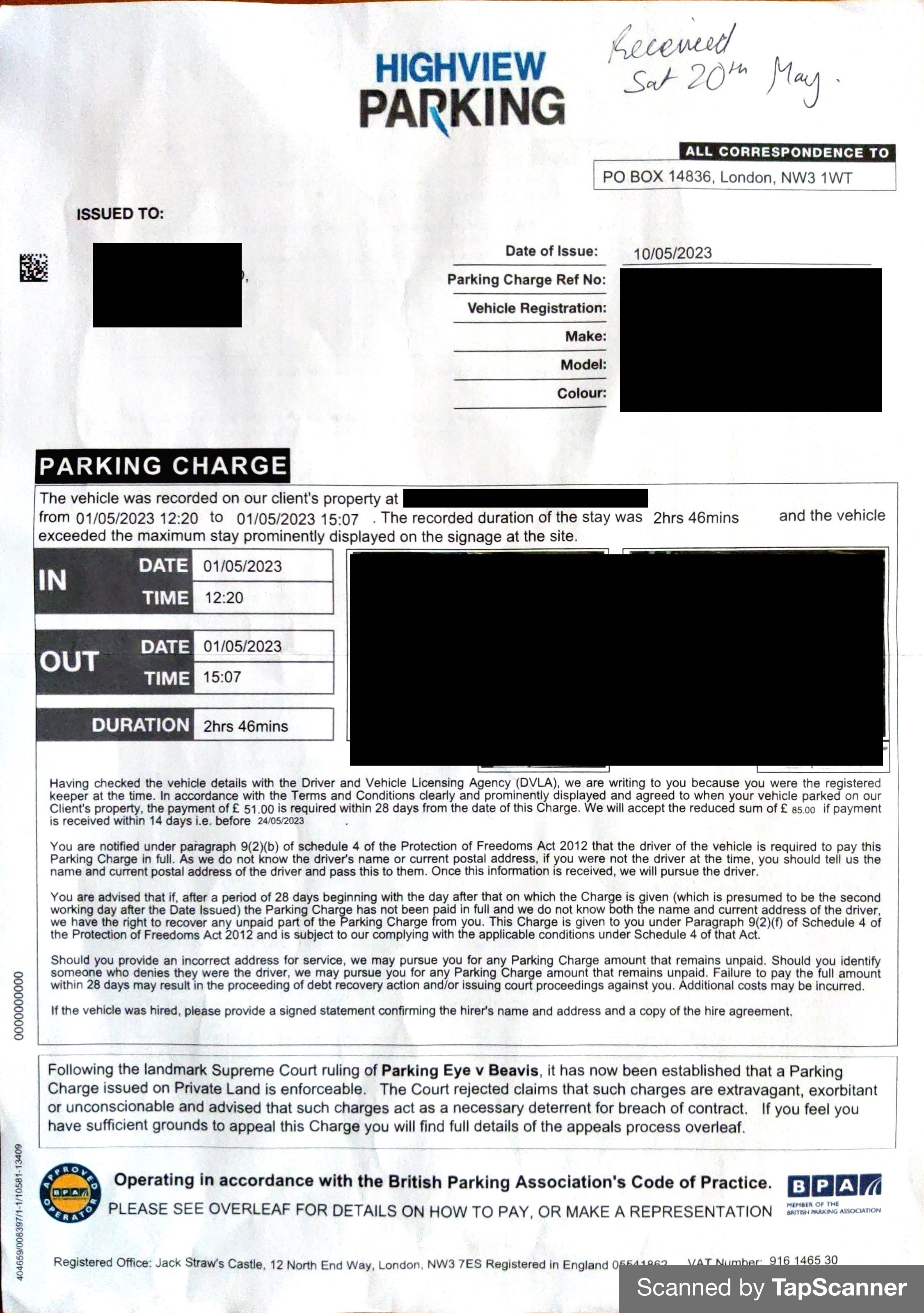 I recently got sent a PCN from Highview regarding alleged overstaying in a car park. The initial contact arrived through my letterbox more than 14 days after the alleged infringement (I have a witness to that) and as such, reading this forum, the POFA wording Citizens Advice (and somewhere else that I can't remember) I believe this is sufficient grounds to expect the charge to be rescinded.4 -