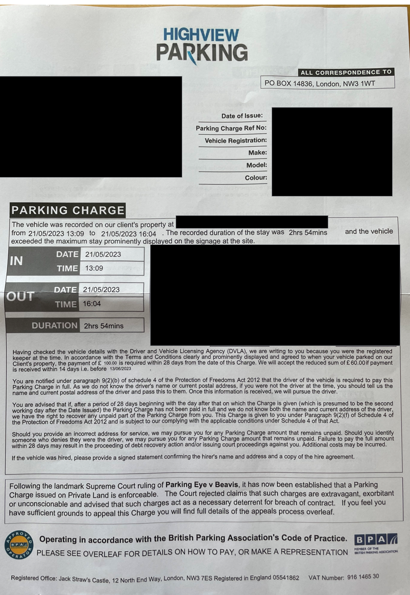 I recently got sent a PCN from Highview regarding alleged overstaying in a car park (maximum is 2 hours unless entered on the iPad for extended stay) on 21/05/2023. The initial contact arrived through my letterbox on 08/06/2023.