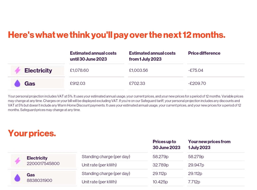 Your personal projection includes VAT at 5%. It uses your estimated annual usage, your current prices, and your new prices for a period of 12 months. Variable prices may change at any time. Charges on your bill will be displayed excluding